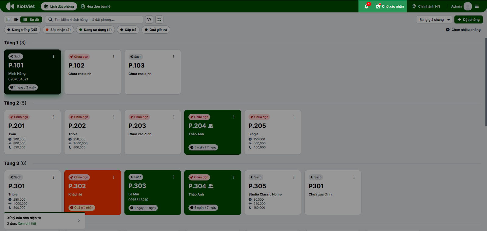- Đặt phòng sẽ chuyển từ trạng thái Chờ xác nhận sang Đã đặt trước và hiện trên sơ đồ phòng.