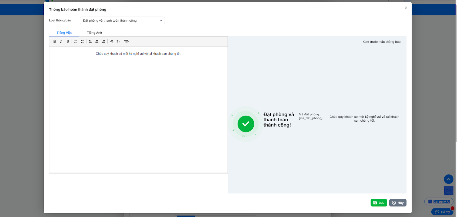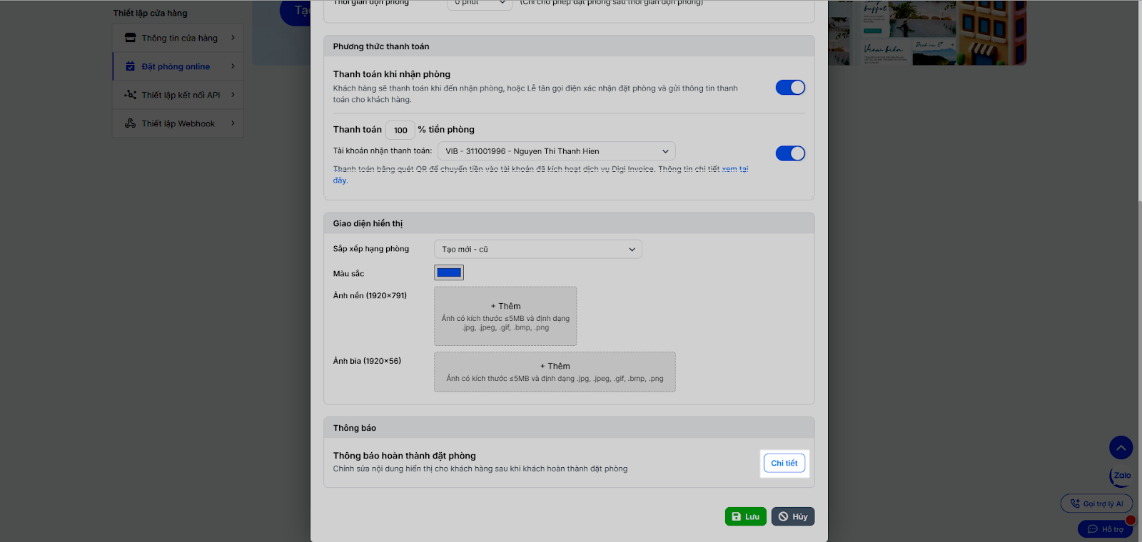 - Nhấn Chi tiết để xem và chỉnh sửa nội dung hiển thị cho khách hàng sau khi khách hoàn thành đặt phòng.