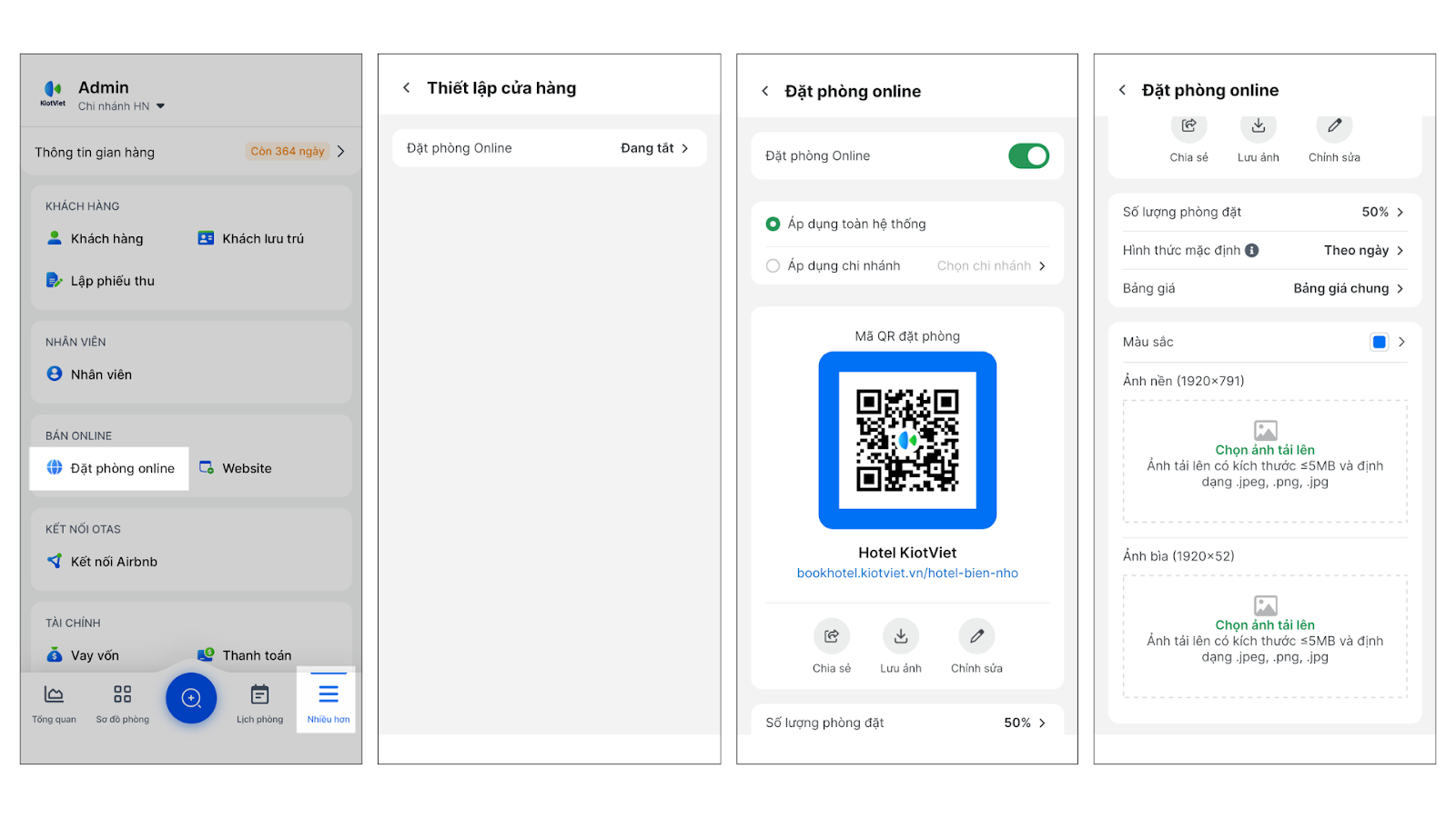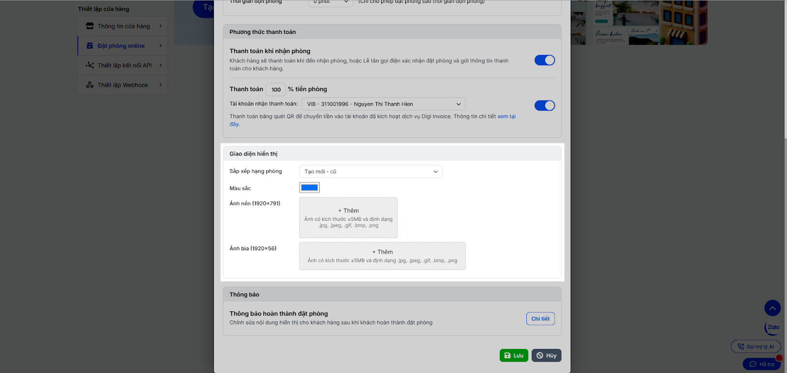- Giao diện: Thiết lập cách Sắp xếp thứ tự hạng phòng, Màu sắc chủ đạo, Ảnh nền, Ảnh bìa.