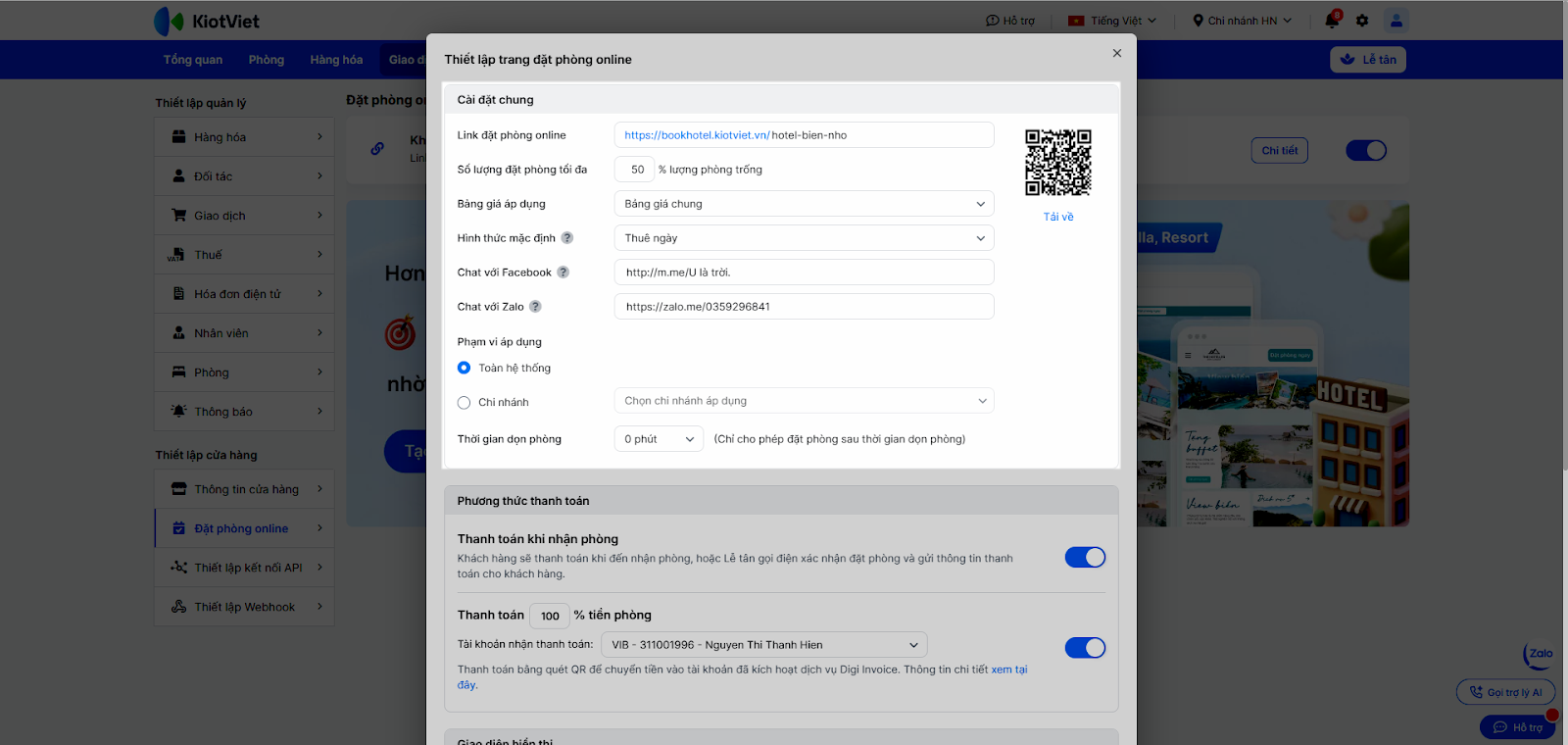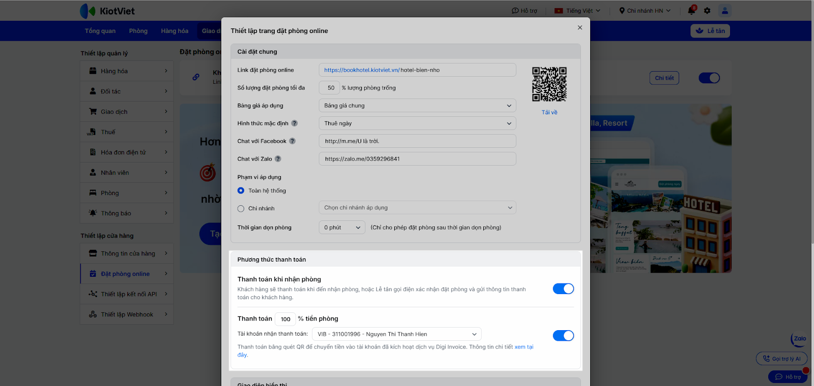 - Tùy chọn Thanh toán % tiền phòng. Nếu bật tùy chọn này → bạn chọn Tài khoản nhận thanh toán. Đây là tài khoản đã kích hoạt dịch vụ Digi Invoice → khách thanh toán bằng quét QR để chuyển tiền vào.