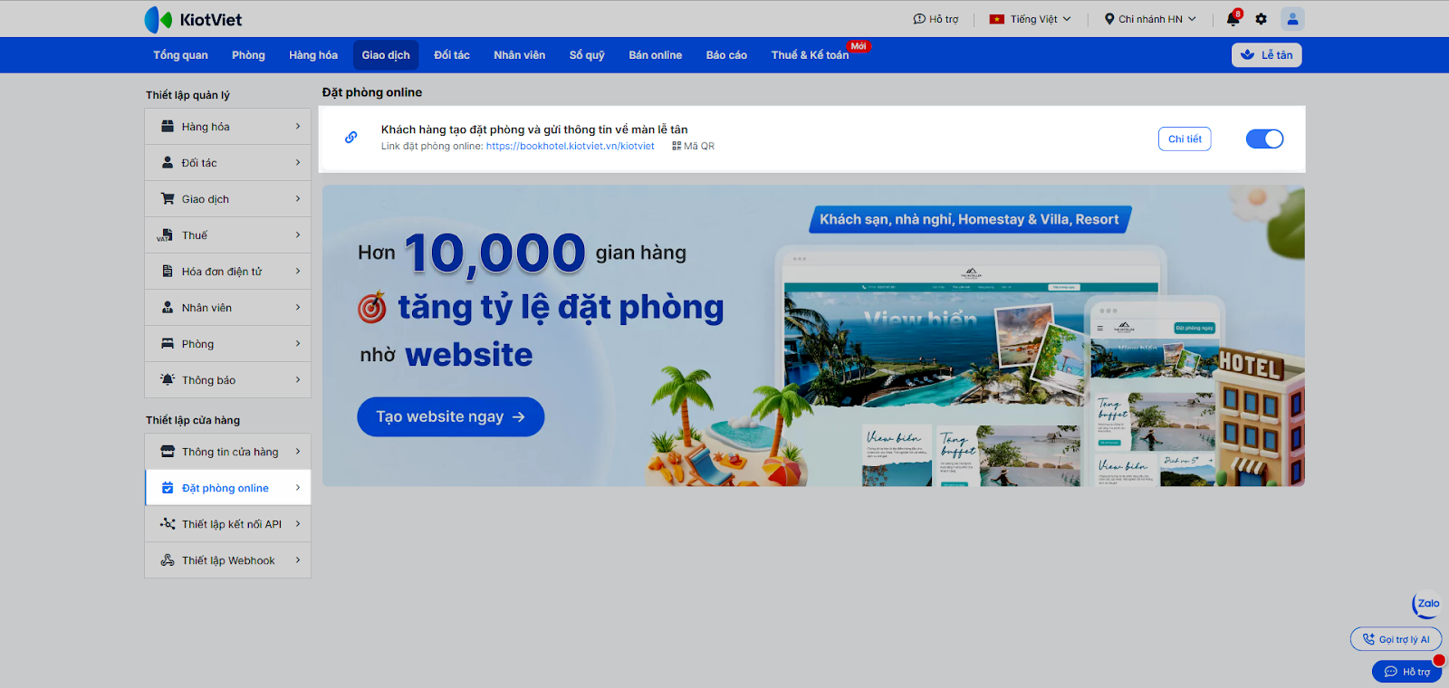 - Trong khối Thiết lập cửa hàng, chọn mục Đặt phòng online.
