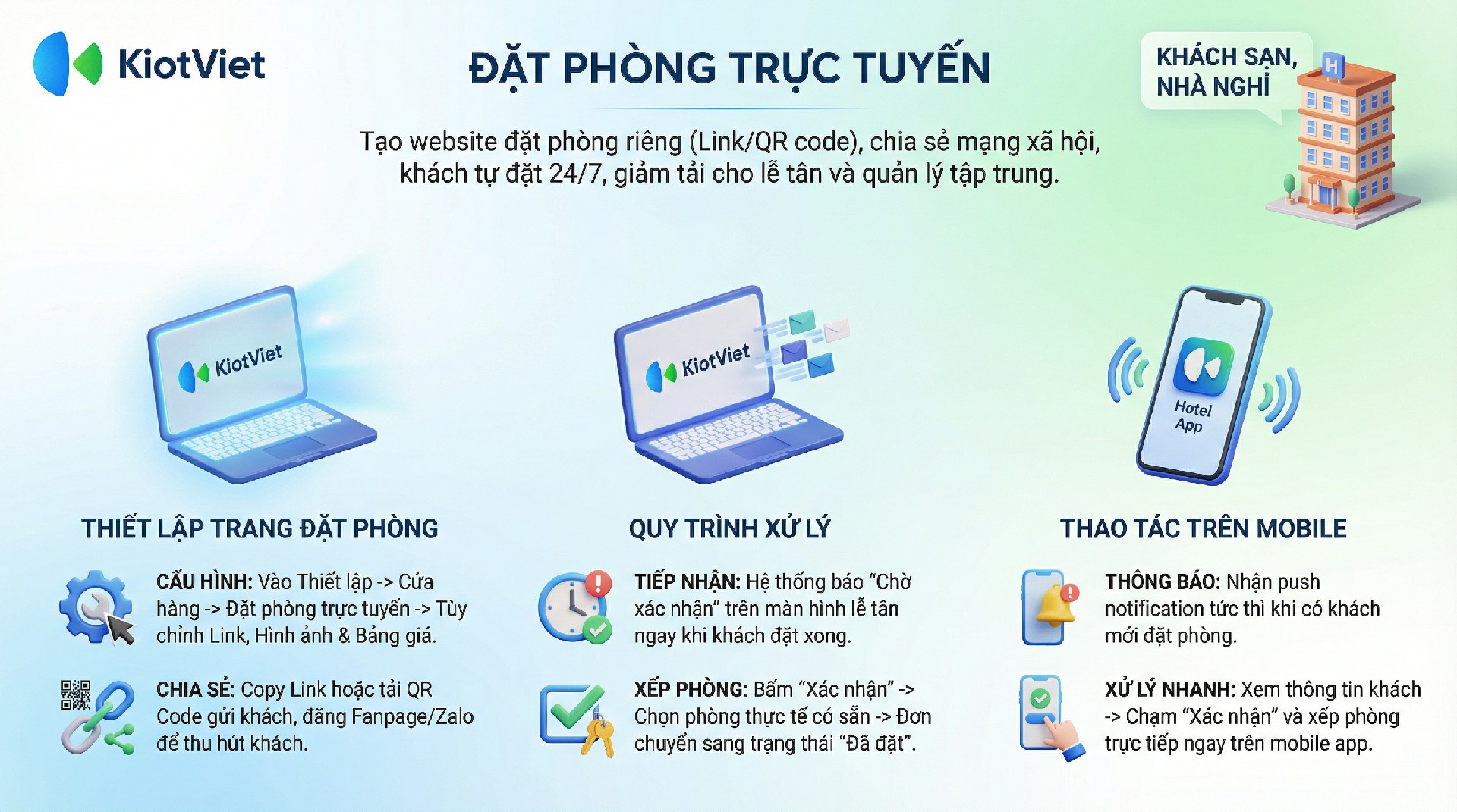 Tính năng Đặt phòng Online cung cấp cho khách sạn một đường link (liên kết) hoặc mã QR để chia sẻ lên Facebook, Zalo hoặc gửi trực tiếp cho khách hàng. Khách hàng có thể truy cập vào đường dẫn này để xem hình ảnh phòng, giá cả, tình trạng phòng trống và tự thực hiện đặt phòng mà không cần gọi điện thoại. Thông tin đặt phòng sẽ được đồng bộ ngay lập tức về màn hình Lễ tân để nhân viên xử lý.