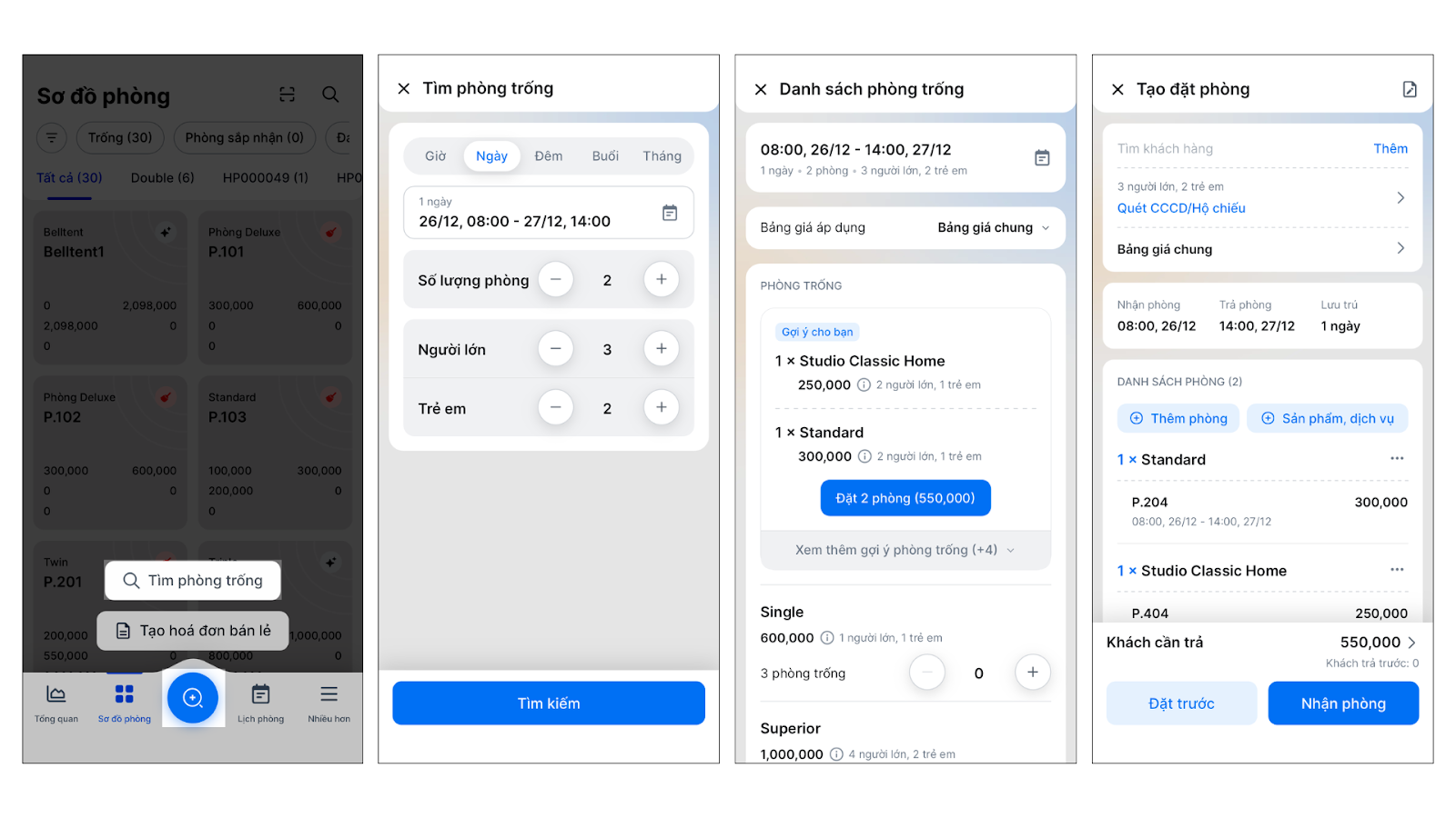 - Tình huống: Bạn cần tìm nhanh phòng trống theo thời gian khách yêu cầu và tạo đơn đặt phòng trực tiếp trên điện thoại.