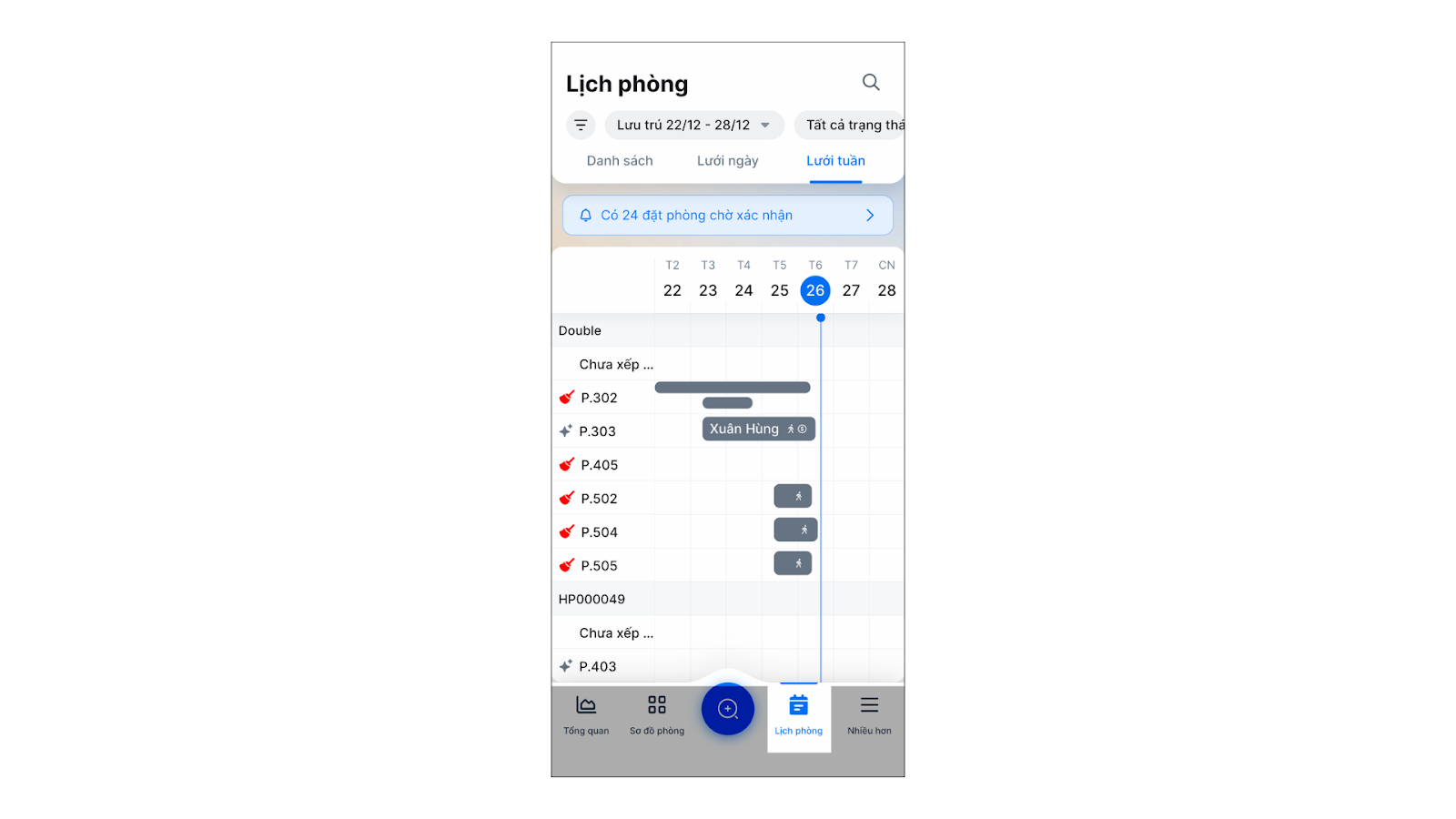 - Trên tab Lịch đặt phòng → kiểu hiển thị Danh sách.