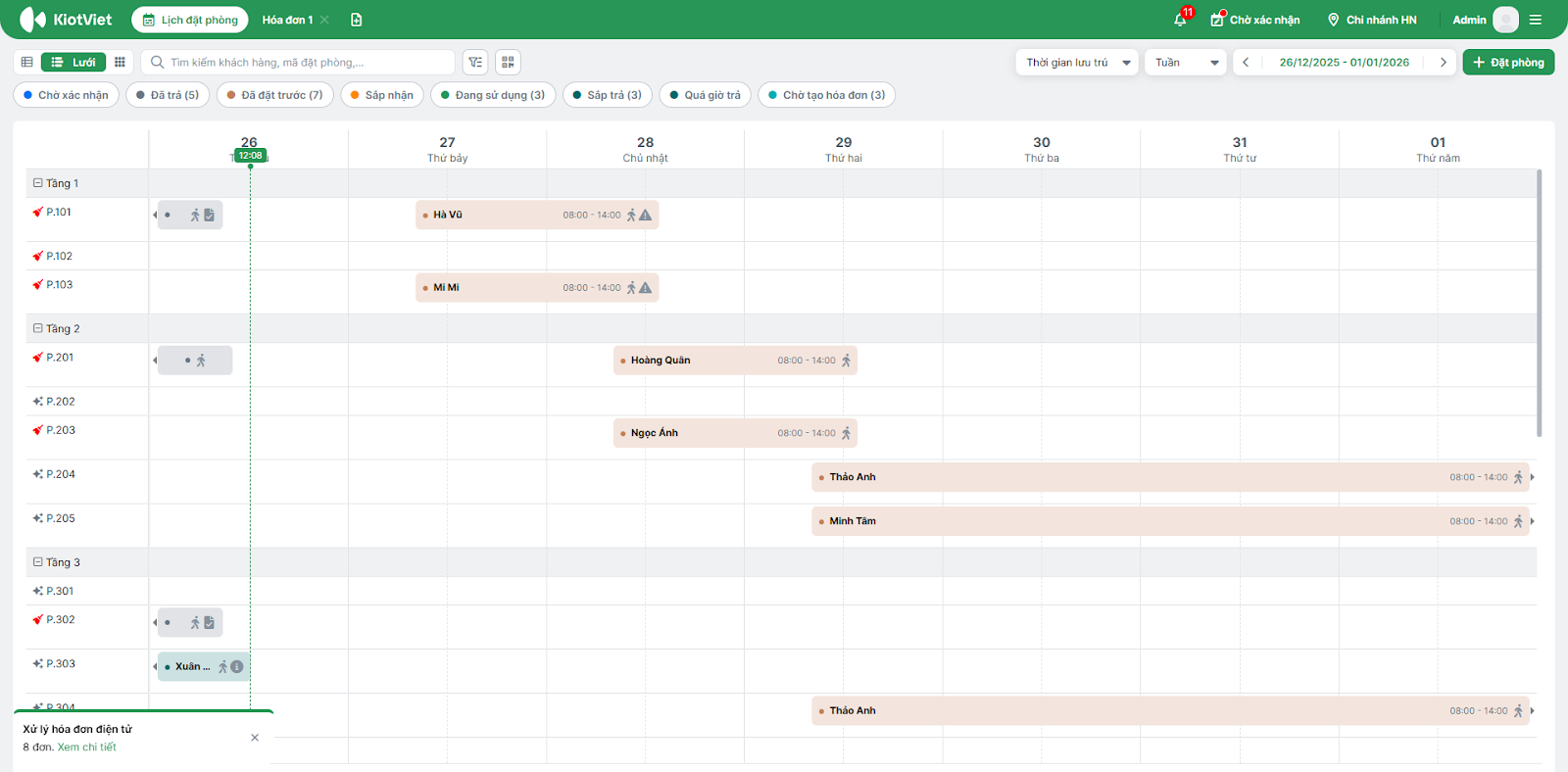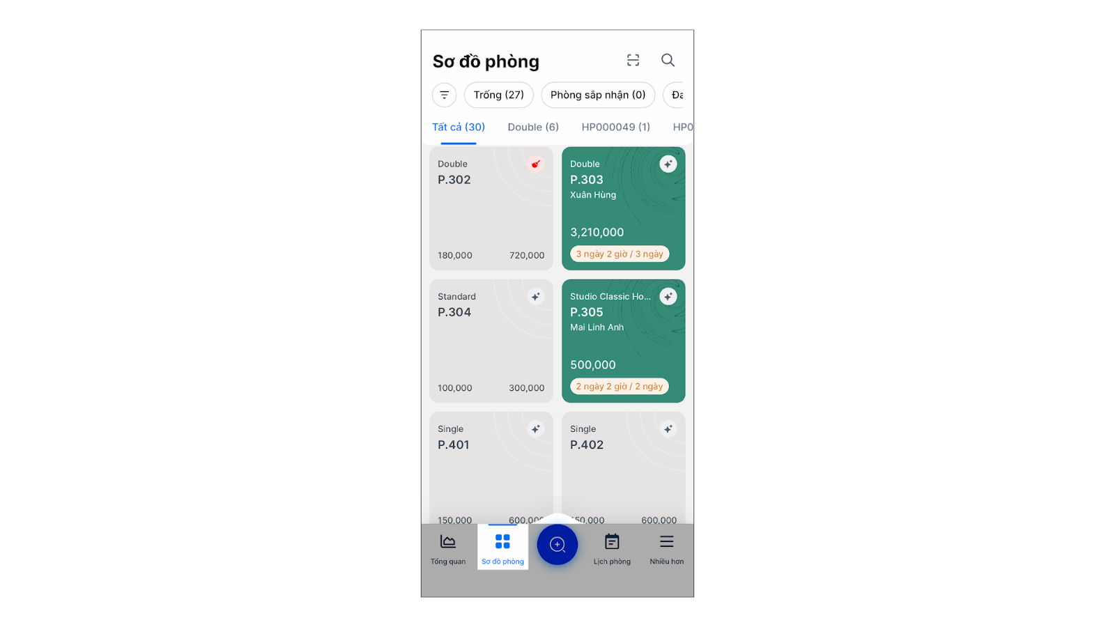 - Trực quan hóa vận hành: Theo dõi danh sách phòng trống, phòng đang có khách, hoặc phòng sắp đến hạn trả qua sơ đồ màu sắc sinh động.
