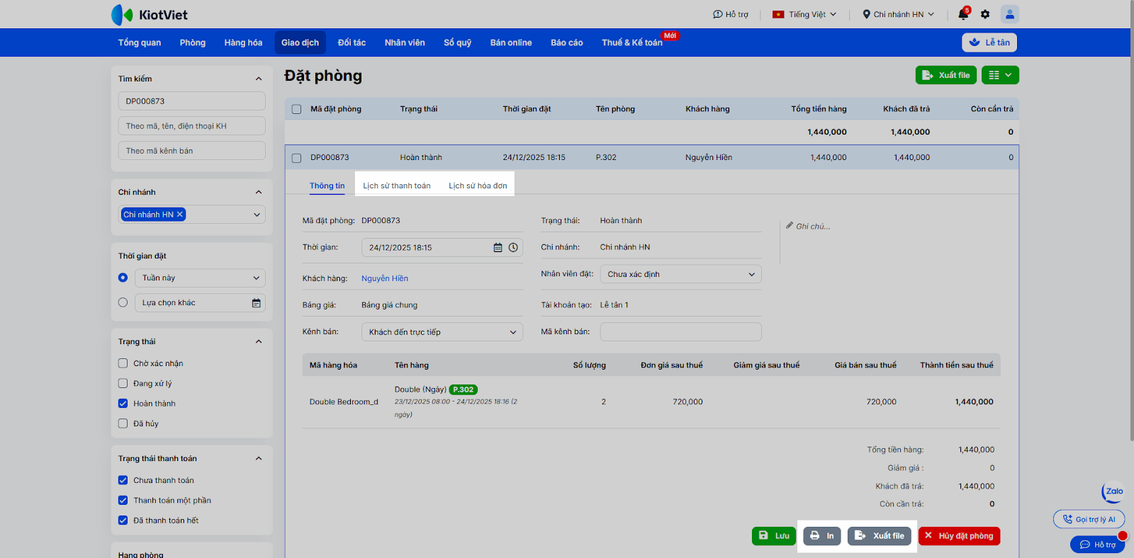 - Tại chi tiết của 1 đặt phòng bạn có thể xem Lịch sử thanh toán, Lịch sử hóa đơn, In và Xuất file.