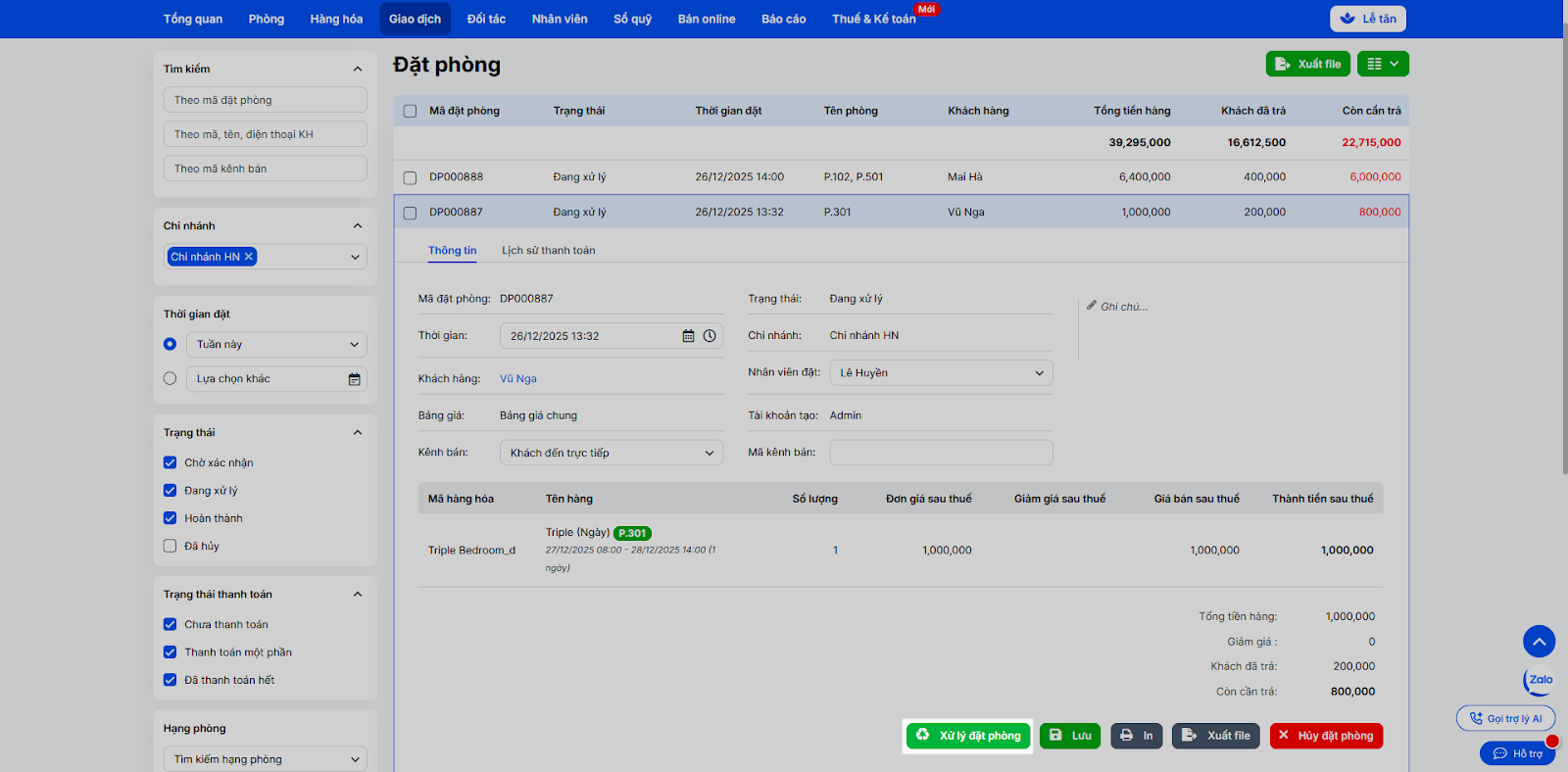 - Với đặt phòng chưa thanh toán, bạn có thể thực hiện cá thao tác: Thanh toán; Thêm sản phẩm, dịch vụ; Sửa đặt phòng; Hủy đặt phòng; In đặt phòng.