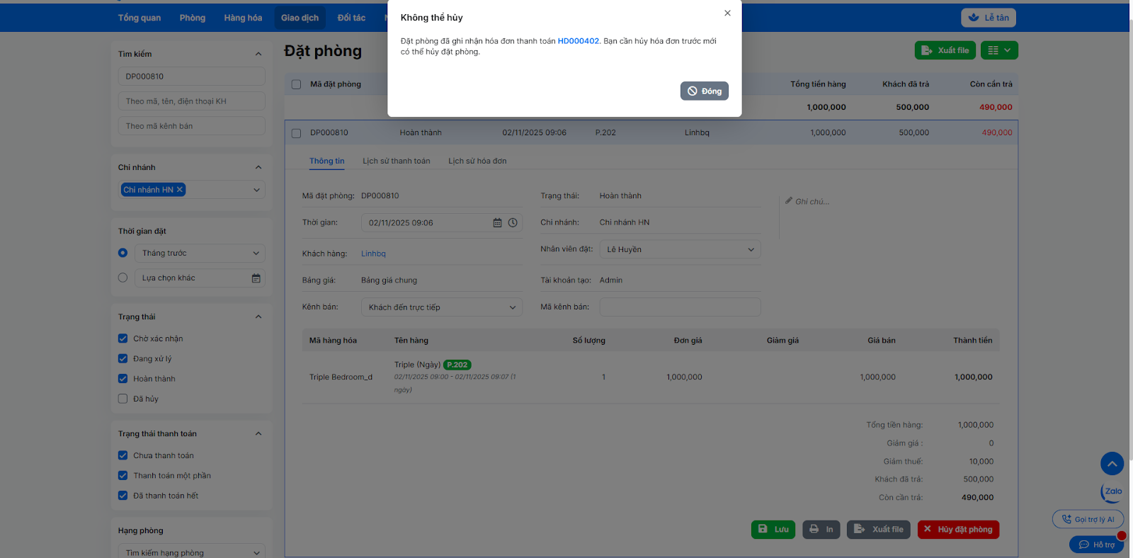 - Lưu ý: Với đặt phòng đã có hóa đơn, bạn cần hủy hóa đơn trước khi hủy đặt phòng.