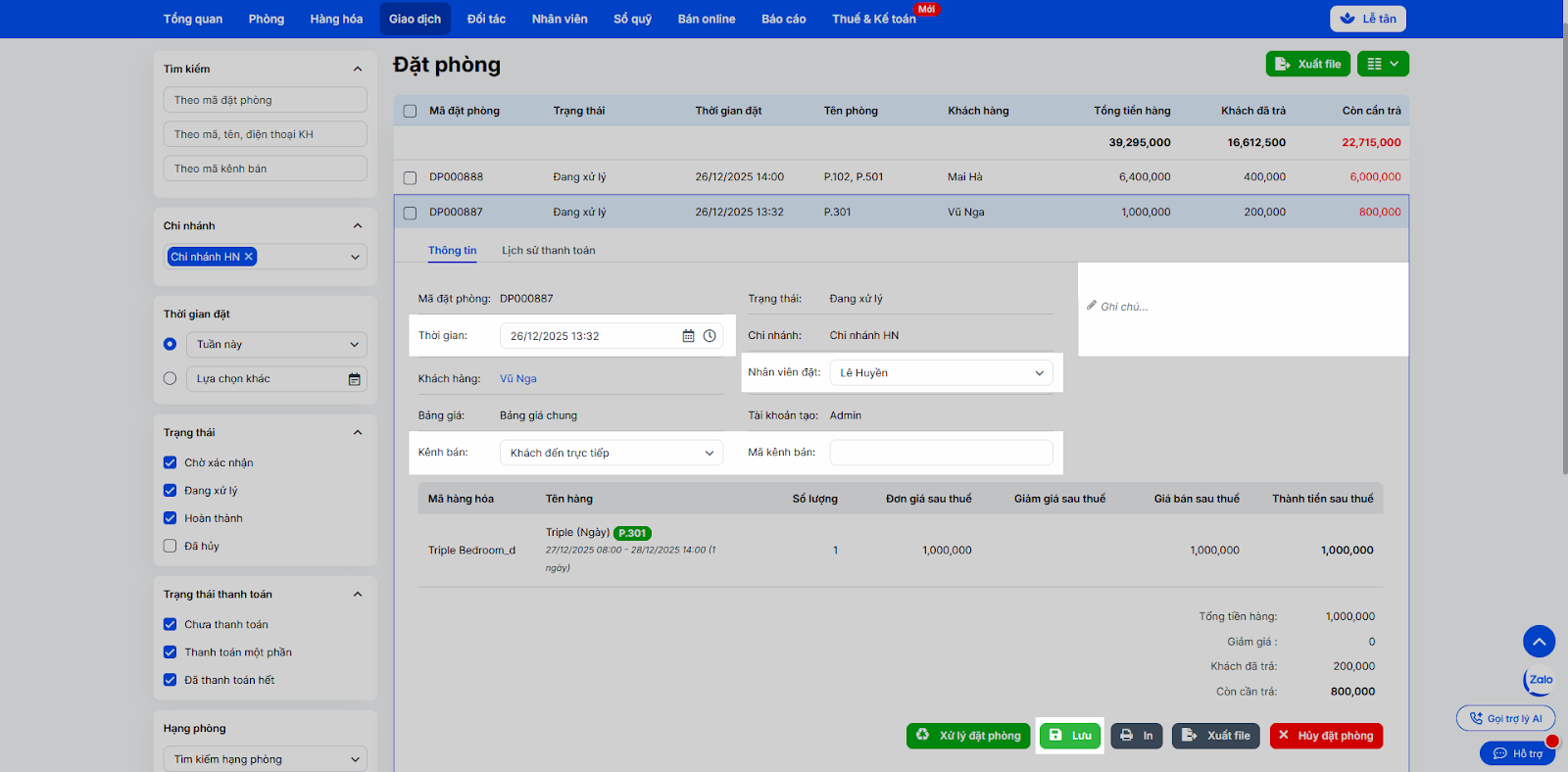 - Để cập nhật thông tin (Thời gian, nhân viên đặt, kênh bán, ghi chú), bạn chọn đặt phòng tương ứng và nhấn Lưu.