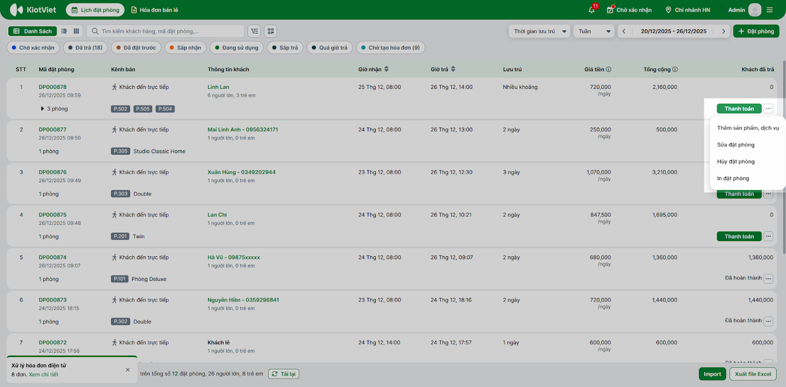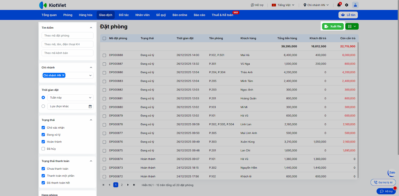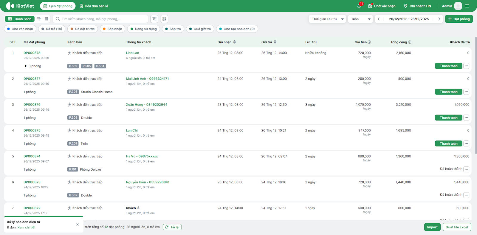 - Hệ thống hiển thị danh sách cá đặt phòng. Bạn có thể thực hiện thao tác Import, Xuất file ngay tại đây.