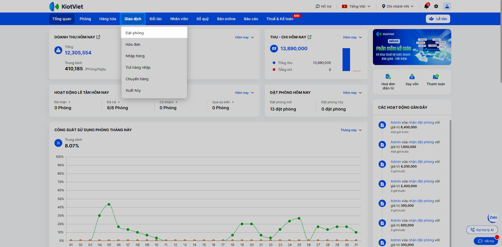 - Vào menu Giao dịch → chọn Đặt phòng.