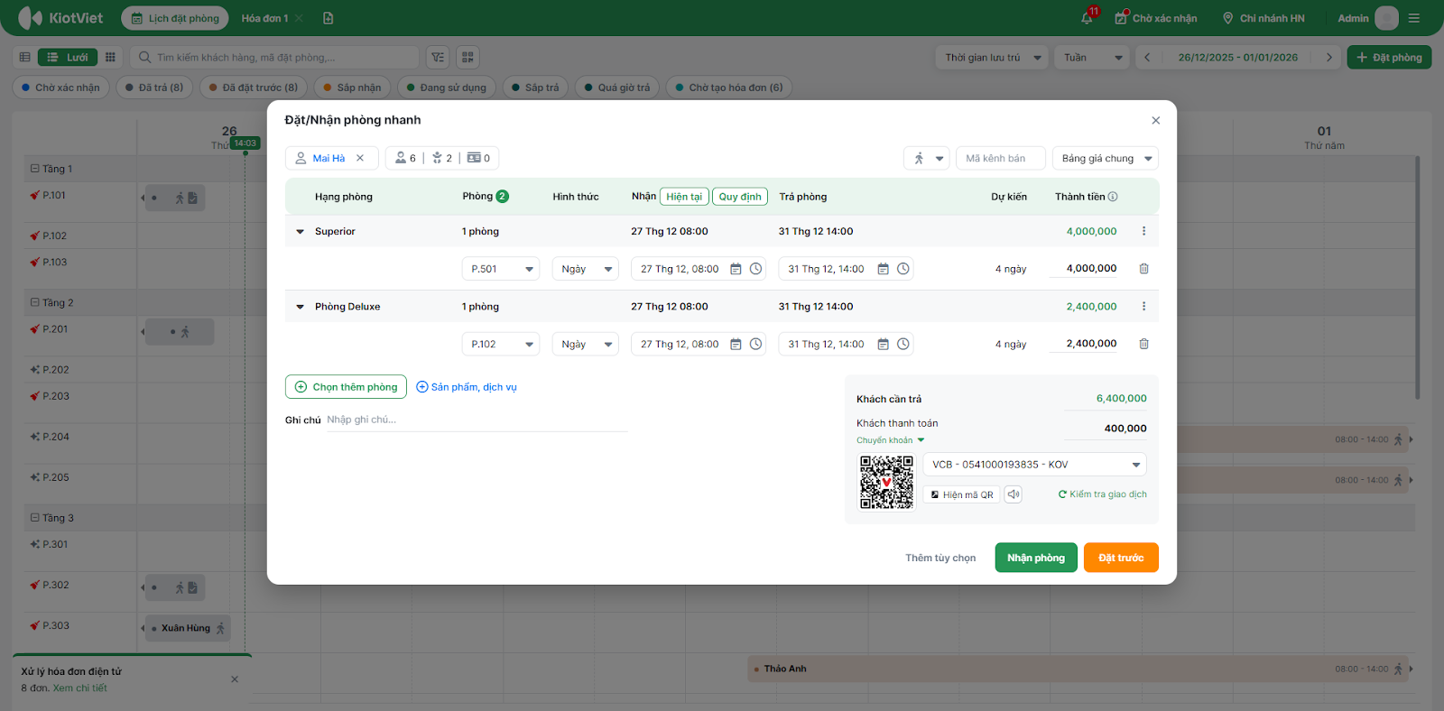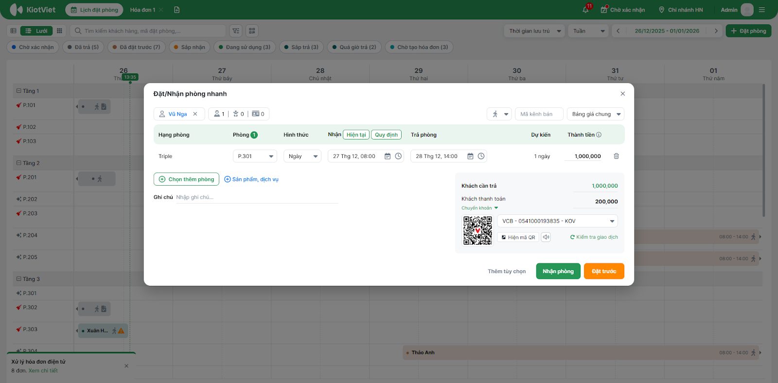- Bạn chọn vào khoảng trống (dạng lưới) hoặc phòng trống (dạng sơ đồ) → hệ thống mở pop-up Đặt/nhận phòng nhanh.