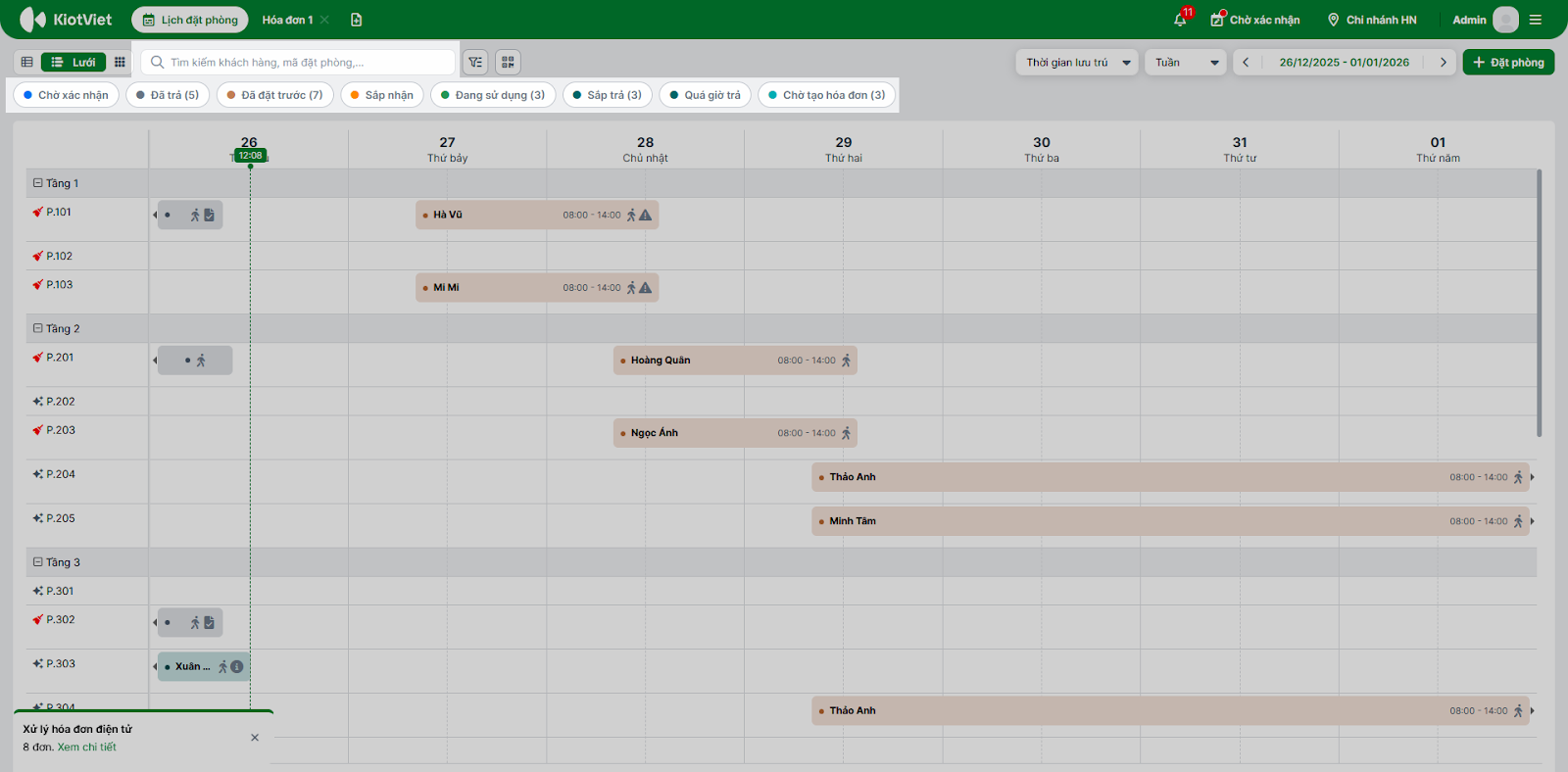 - Tình huống: Bạn đang ở màn hình Lễ tân và cần xem lại danh sách cá đặt phòng trong tuần này.