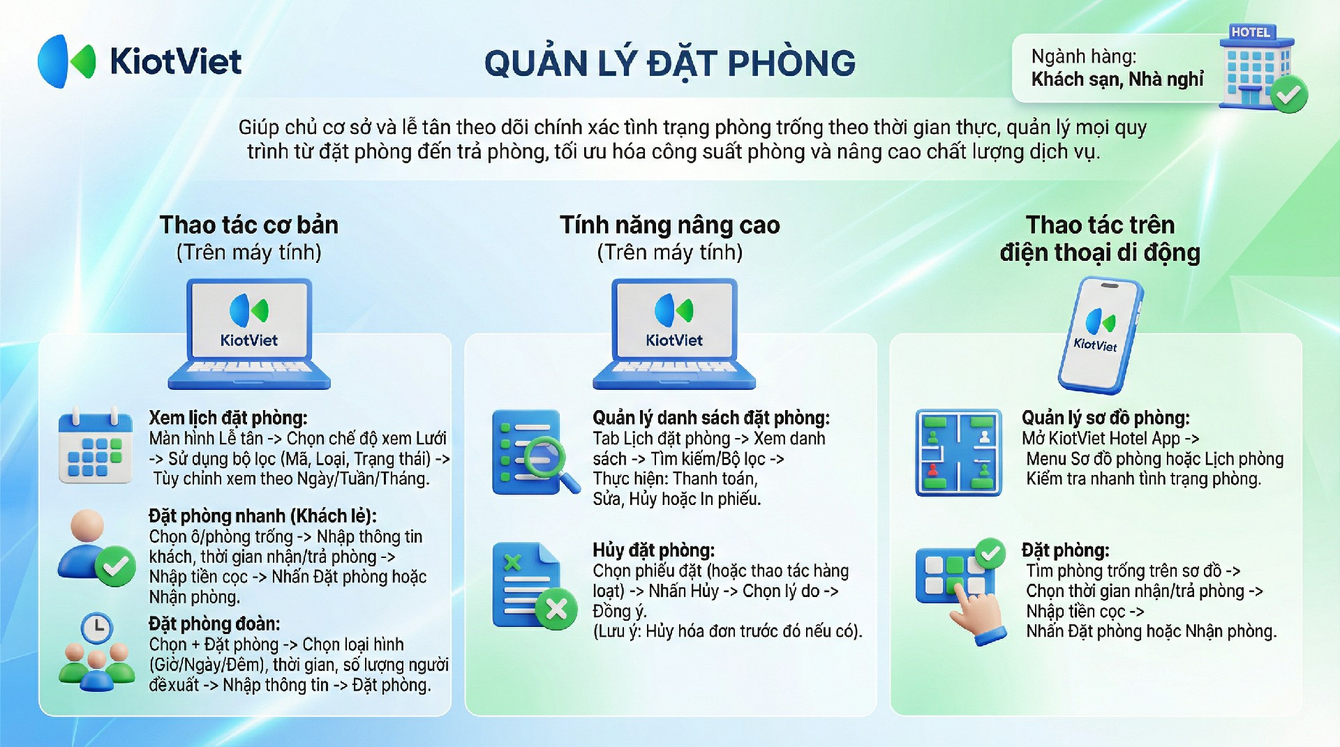 - Linh hoạt trên mọi thiết bị: Đồng bộ dữ liệu tức thì giữa máy tính tại quầy lễ tân và ứng dụng di động.