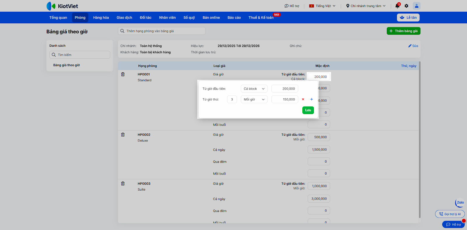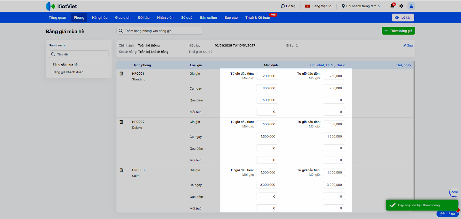 Lưu ý: Nếu hạng phòng nào chưa được thiết lập trong bảng giá này, hệ thống sẽ tính theo giá chung mặc định.