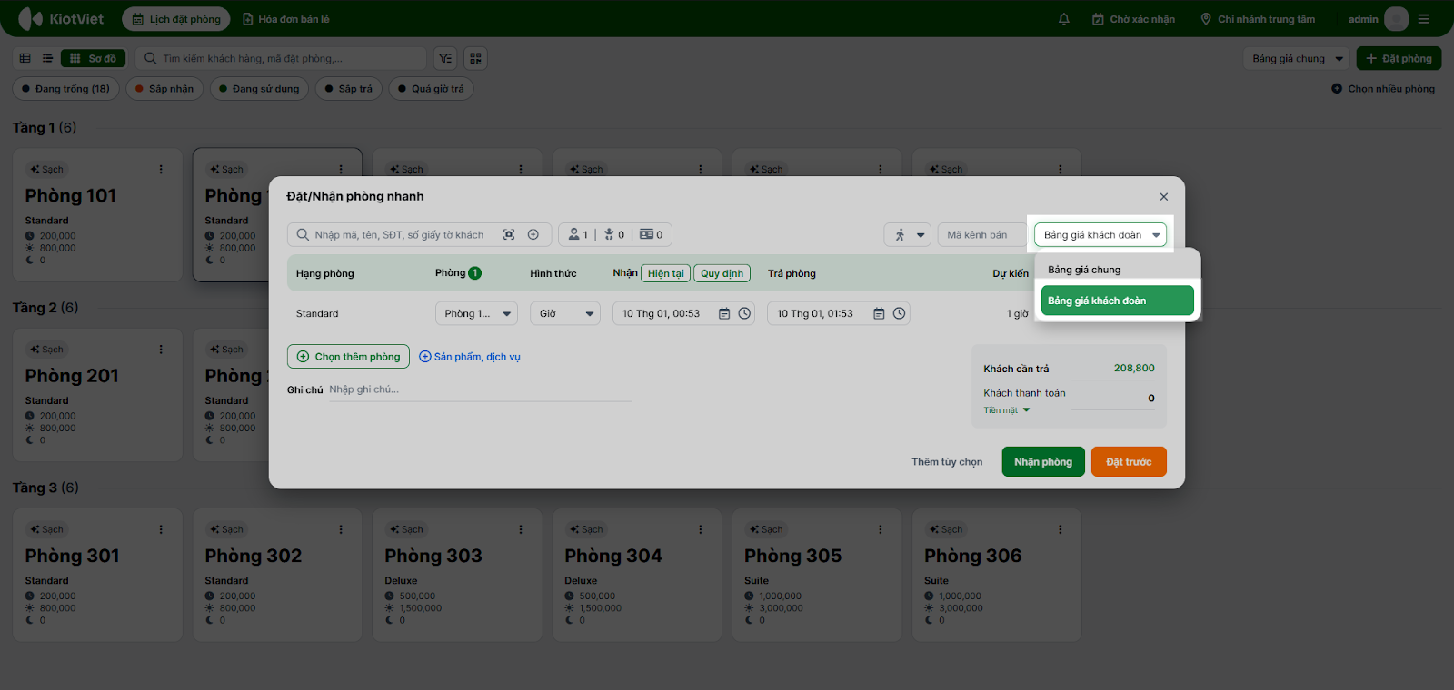 - Tình huống: Khách đoàn đến nhận phòng và bạn cần áp dụng “Bảng giá khách đoàn” thay vì giá niêm yết thông thường để tính tiền ưu đãi cho họ.