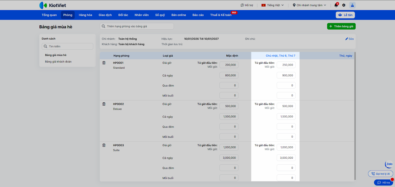 - Tình huống: Bạn muốn tạo một “Bảng giá Mùa Hè” áp dụng giá cao hơn vào các ngày cuối tuần (Thứ 6, 7, CN) cho tất cả các hạng phòng.