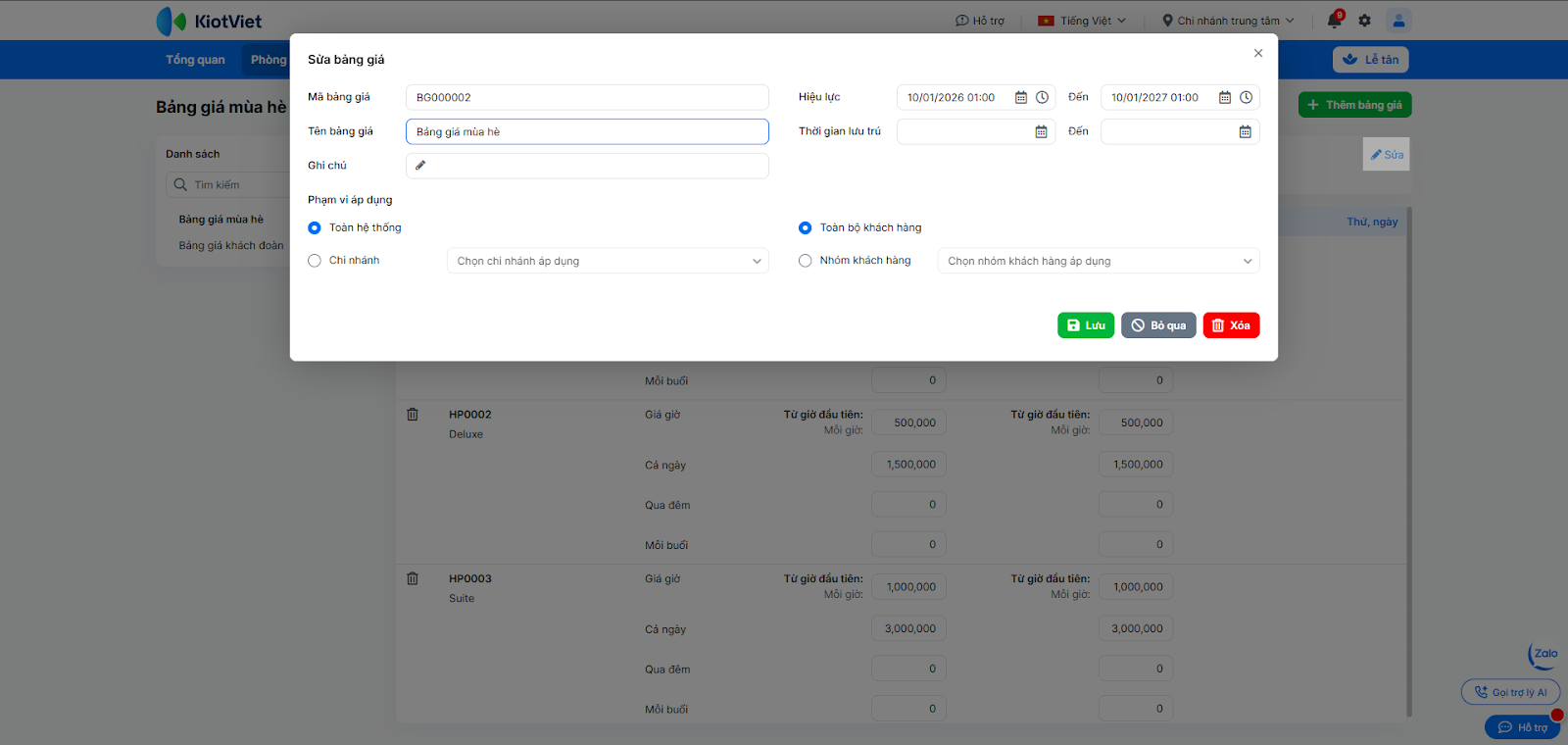 - Tình huống: Hết mùa cao điểm, bạn muốn sửa lại giá hoặc xóa bảng giá cũ để tránh nhân viên chọn nhầm.