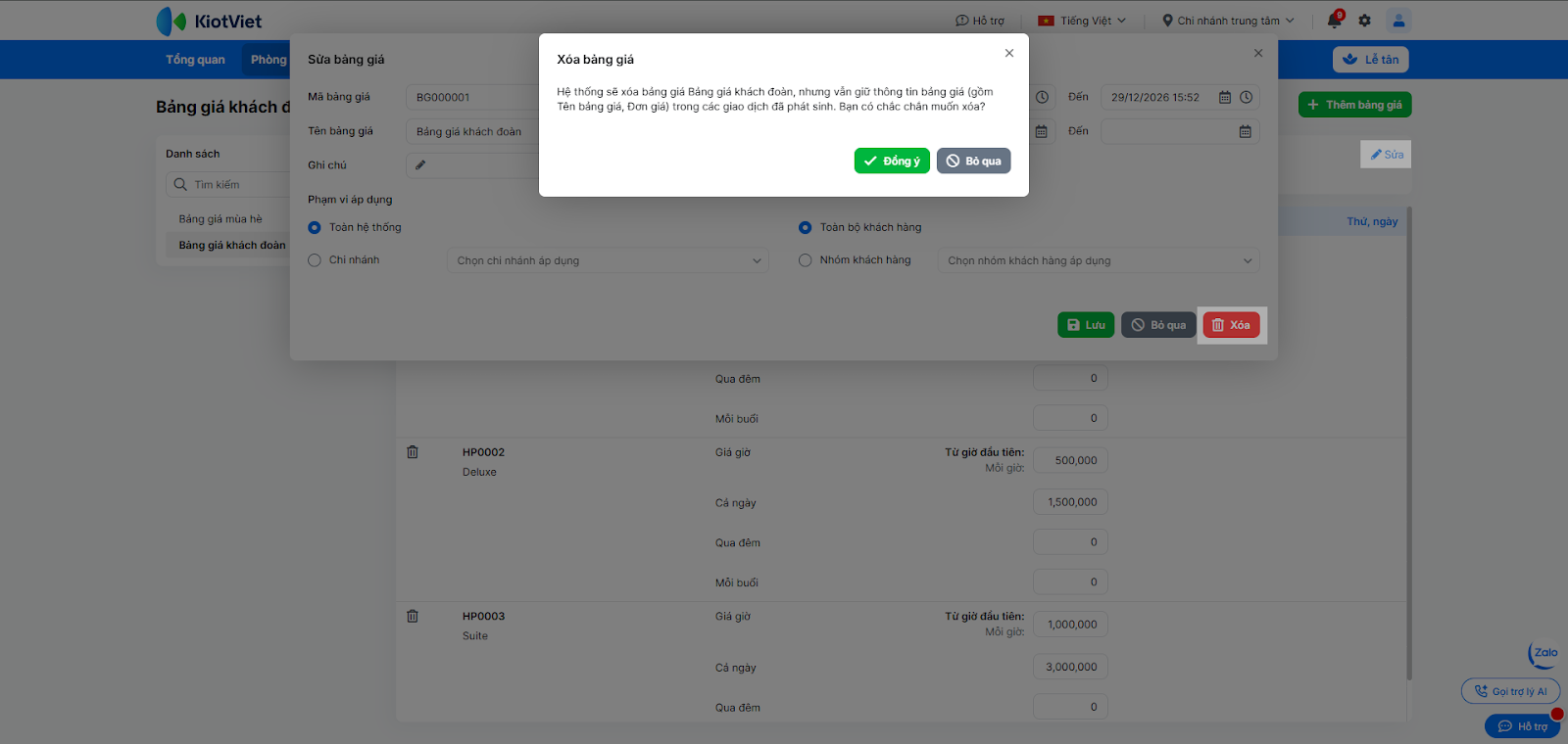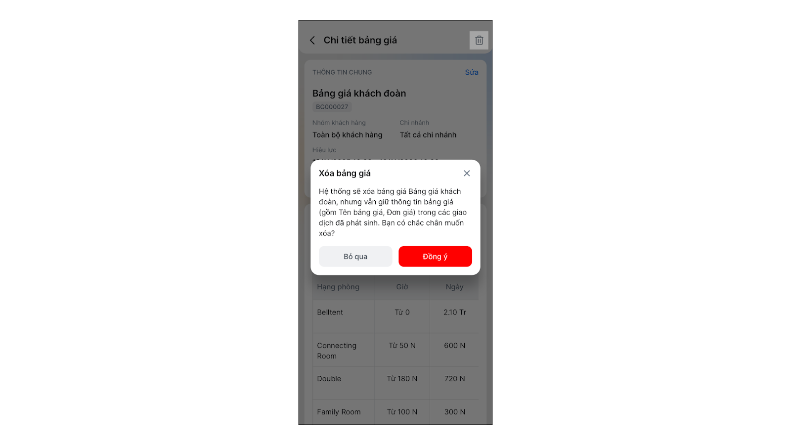 - Tình huống: Phát hiện sai sót trong giá phòng hoặc muốn xóa bảng giá cũ để tránh nhầm lẫn.