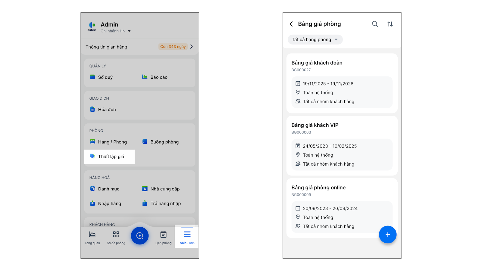 Tính năng Thiết lập bảng giá phòng trên ứng dụng di động hỗ trợ cửa hàng thực hiện các thao tác: Xem, thêm mới, sửa, xóa bảng giá.