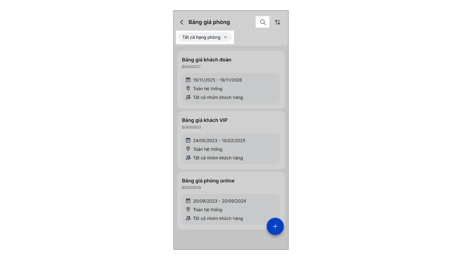 - Tại màn hình Bảng giá phòng, nhấn vào biểu tượng (+) ở góc phải.