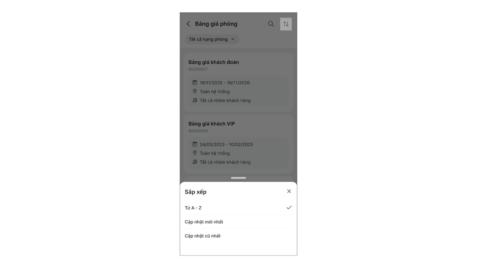 - Để tìm kiếm và lọc bảng giá bạn nhấn vào biểu tượng kính lúp và bộ lọc hạng phòng.