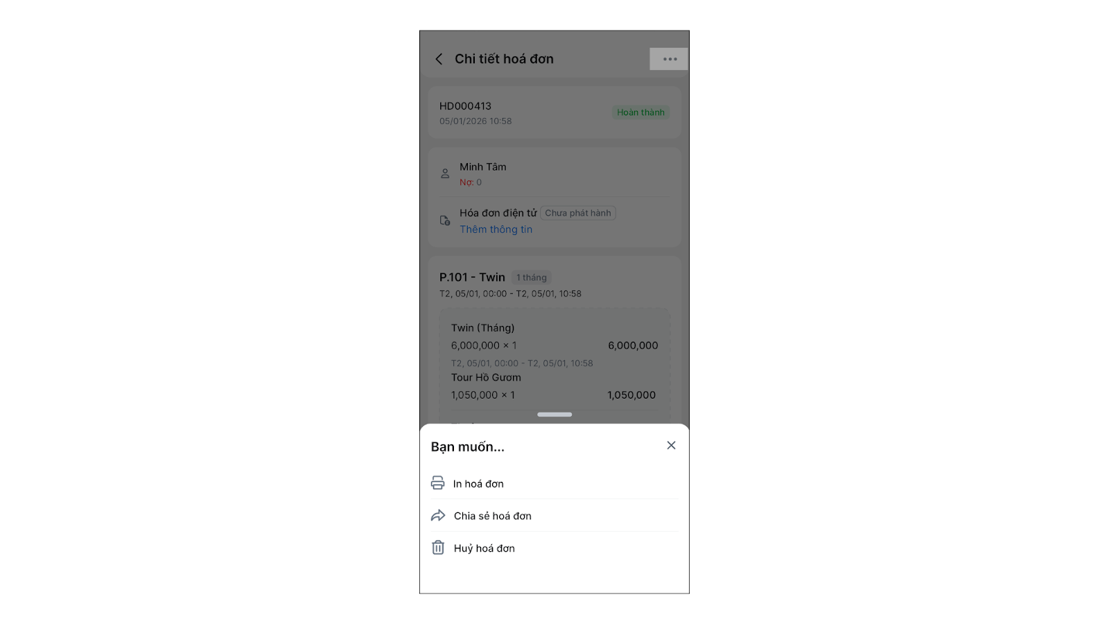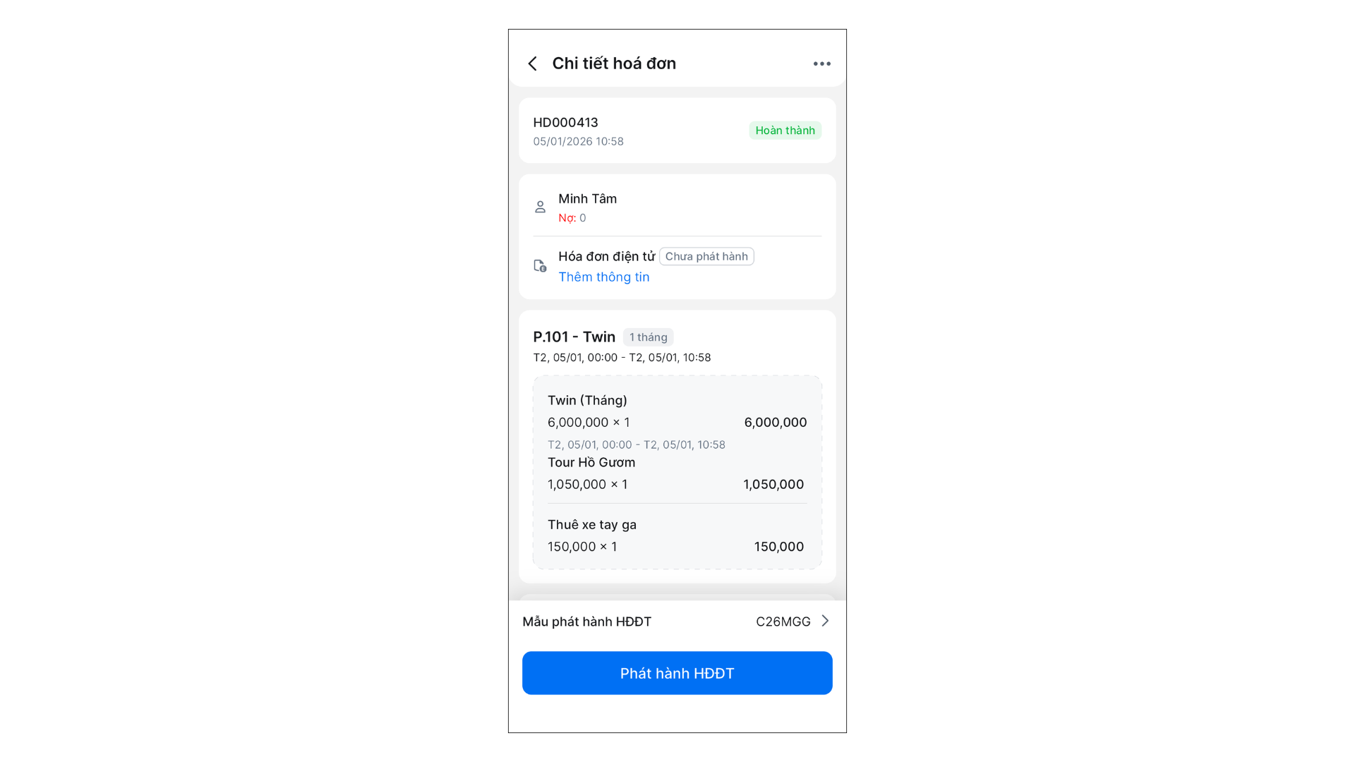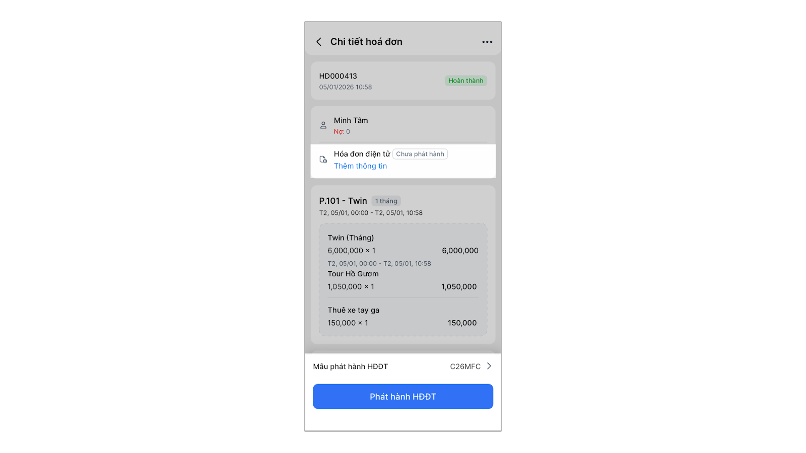 - Tình huống: Bạn đang kiểm tra chi tiết hóa đơn và cần phát hành hóa đơn điện tử ngay trên điện thoại.