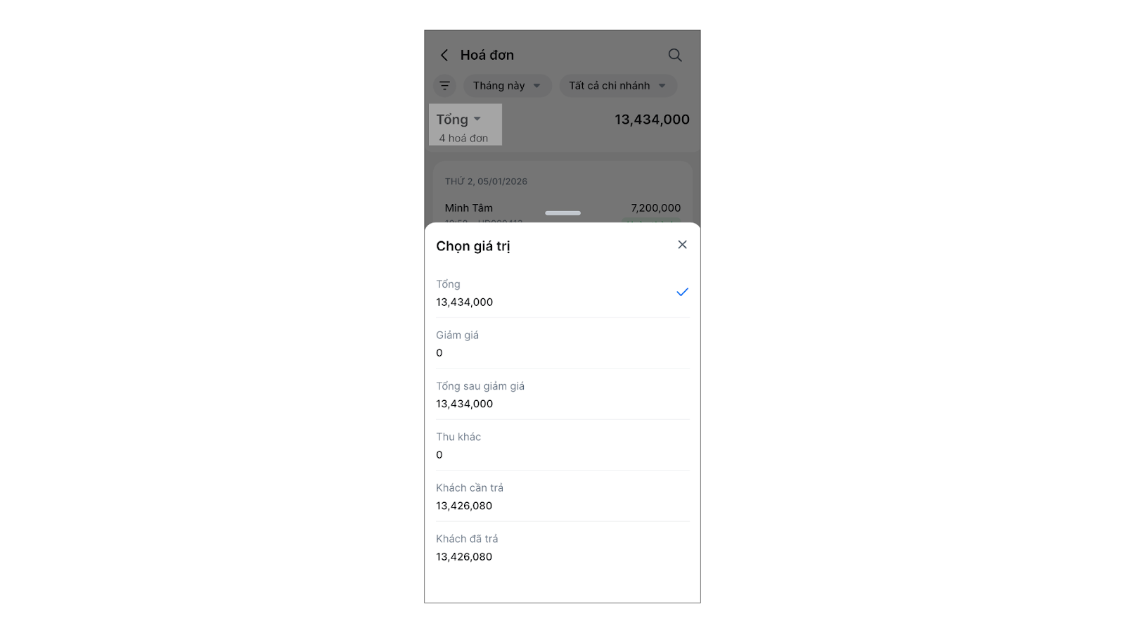 - Chạm vào một hóa đơn bất kỳ để xem chi tiết.
