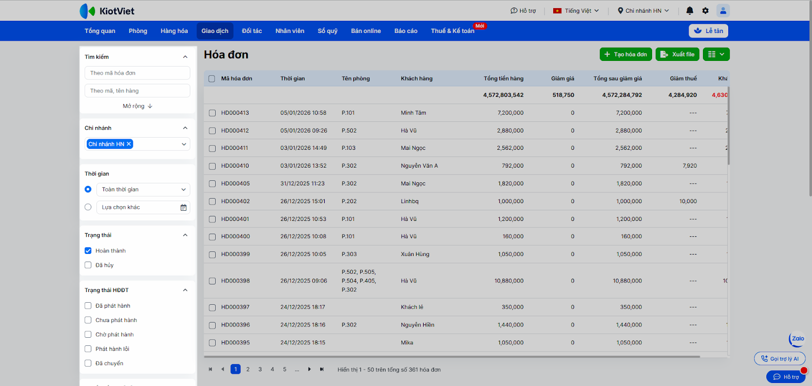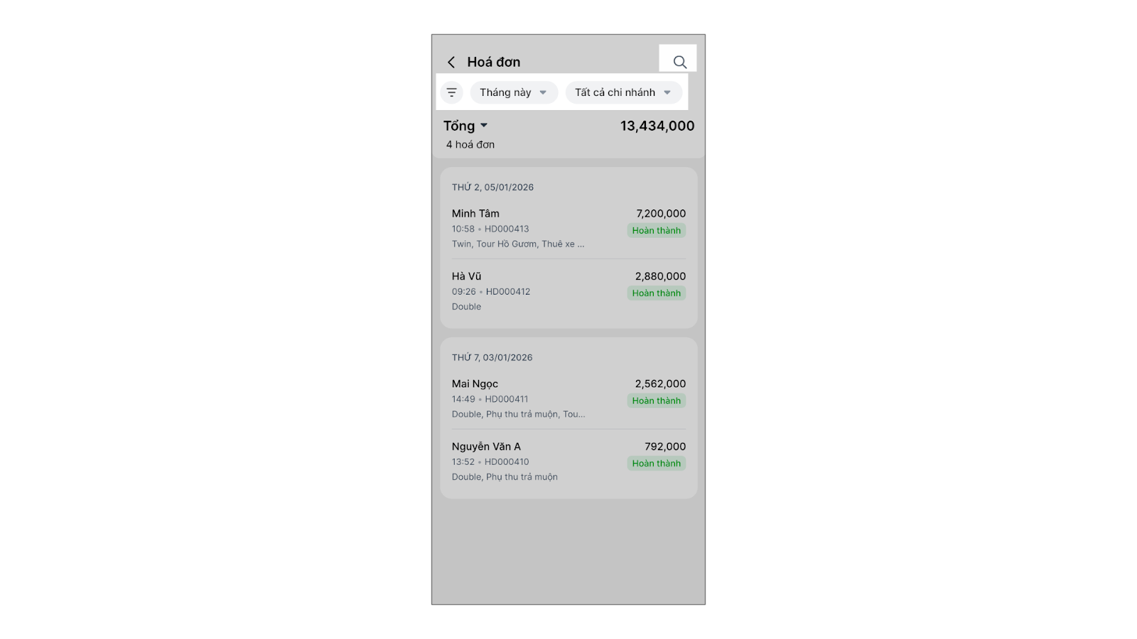 - Để tìm kiếm hóa đơn bạn nhấn vào biểu tượng kính lúp hoặc các bộ lọc Trạng thái, Thời gian, Chi nhánh.