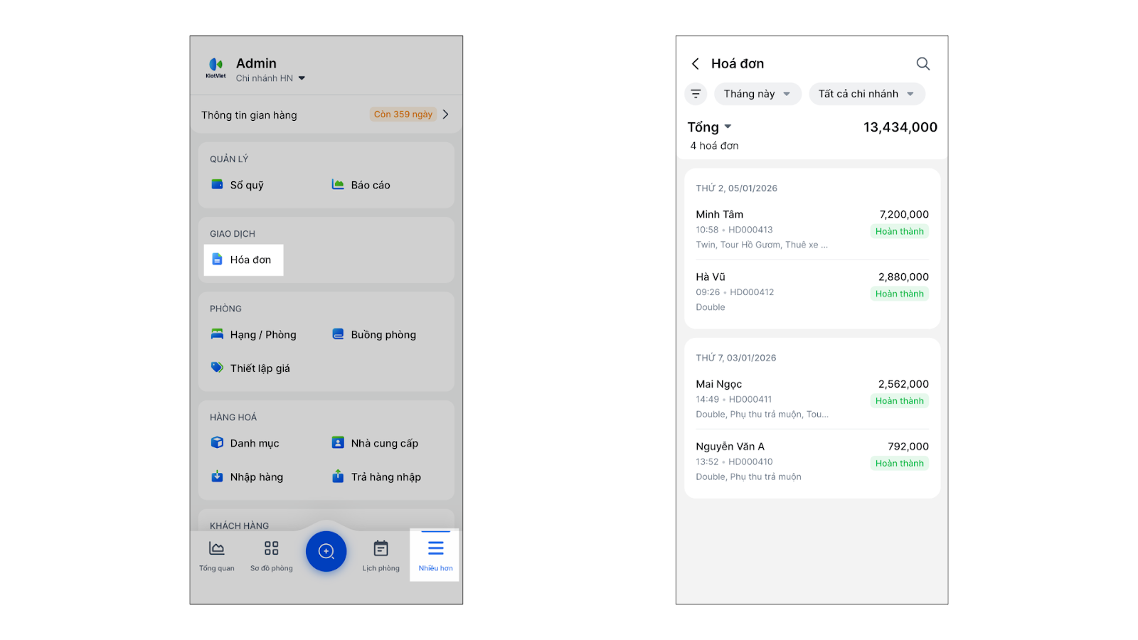 Dưới đây là các thao tác tra cứu, in ấn và xem lịch sử hóa đơn dành cho lễ tân và quản lý.