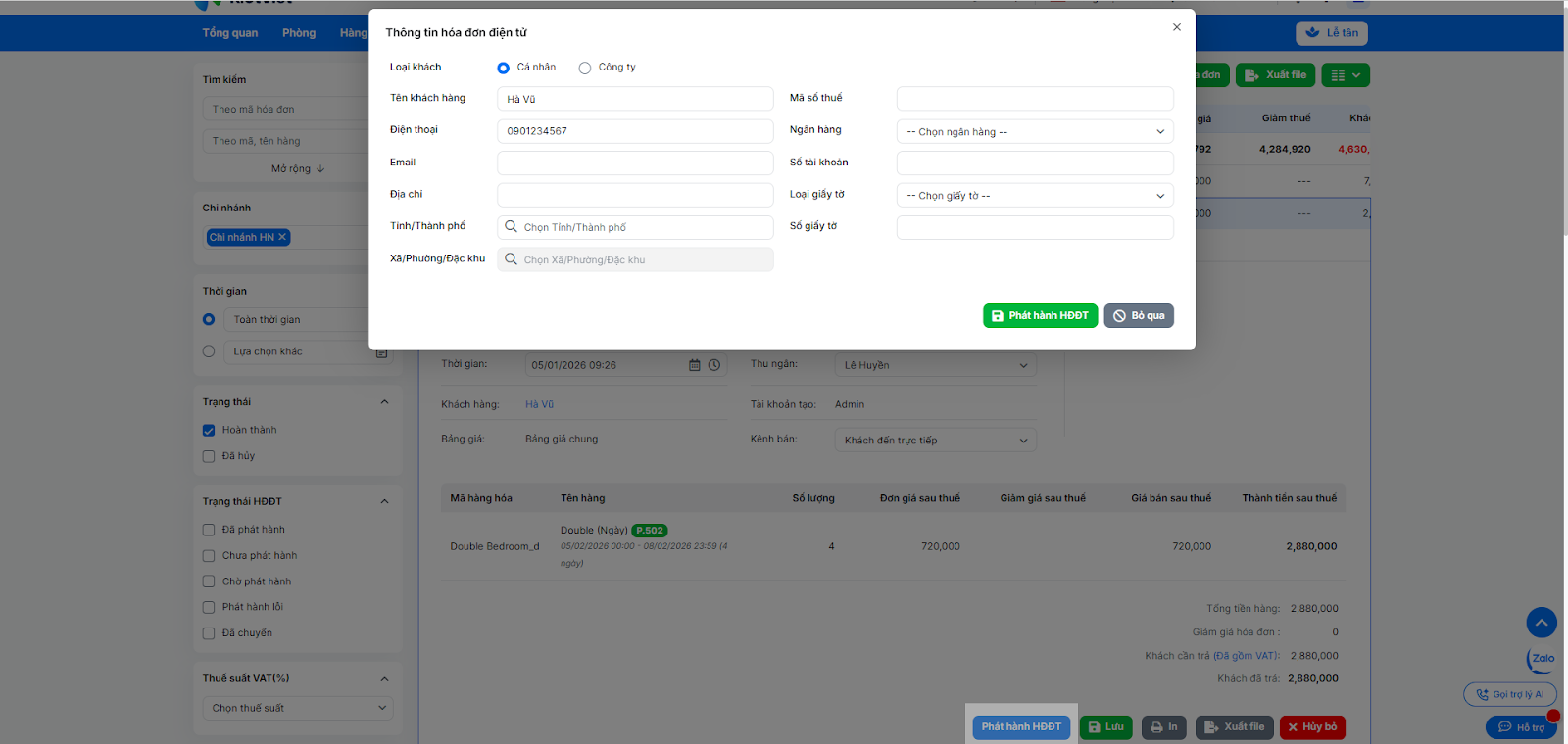 - Tình huống: Khách hàng là công ty yêu cầu xuất hóa đơn điện tử ngay sau khi check-out.