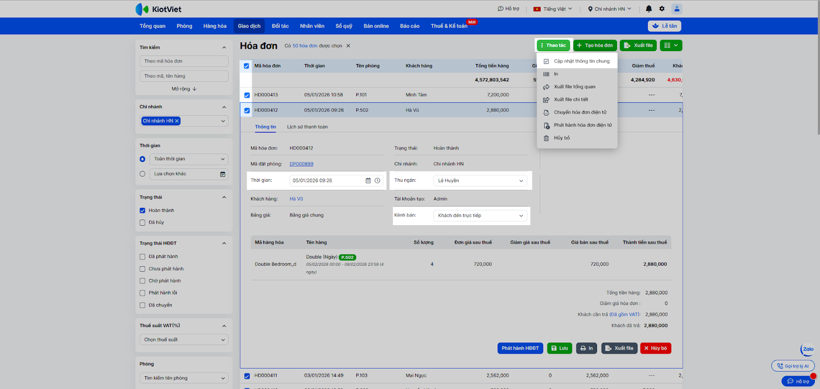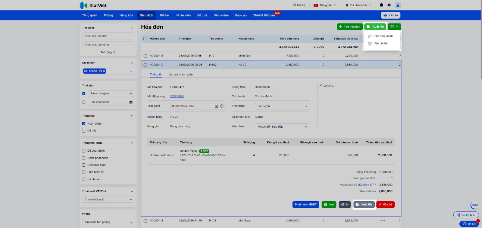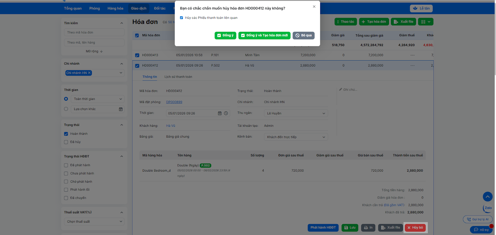 - Lưu ý: Việc hủy hóa đơn sẽ tự động giảm trừ doanh thu, cộng lại tồn kho hàng hóa (nếu có bán dịch vụ/minibar) và cập nhật lại công nợ khách hàng.