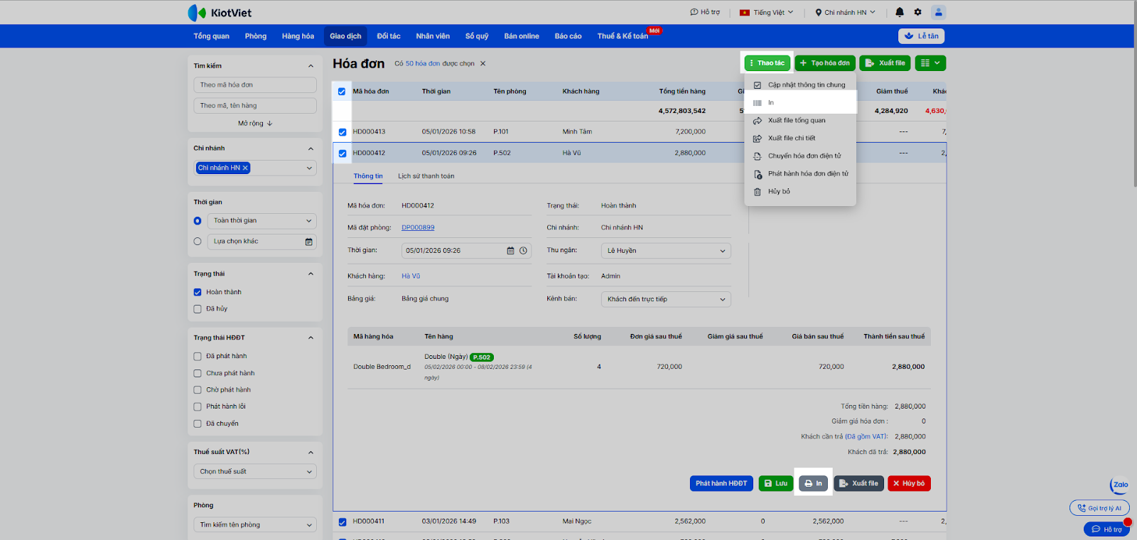 - In hóa đơn: Nhấn vào hóa đơn cần in → chọn In hoặc tích chọn nhiều hóa đơn cần in → nhấn Thao tác → chọn In.