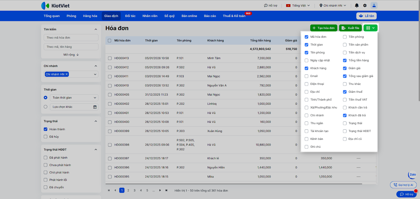 - Để hiển thị thêm thông tin (như Thu ngân, Kênh bán), kích chọn biểu tượng Tùy chọn (hình bánh răng) và tích vào các thông tin cần hiện.