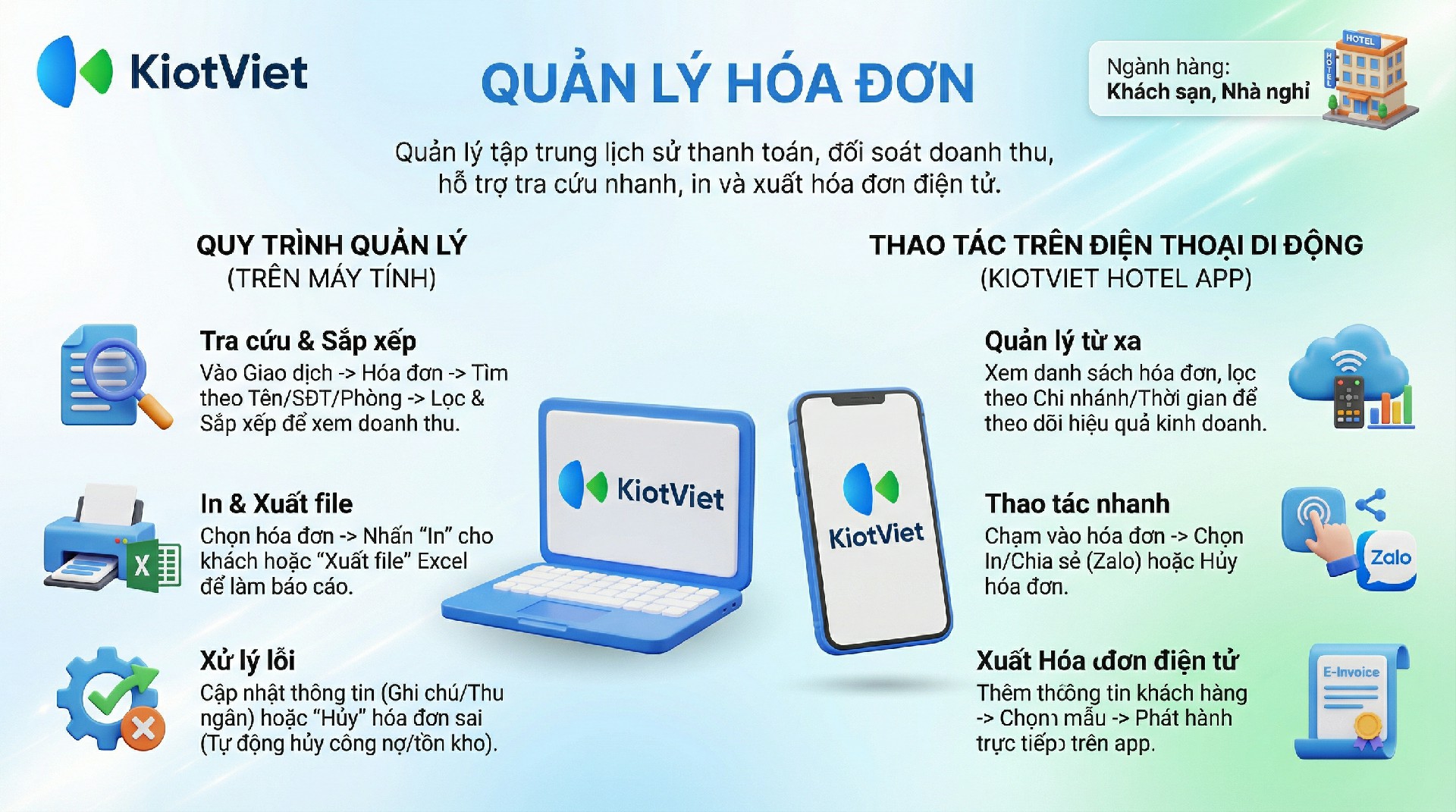 Quản lý hóa đơn là nghiệp vụ sau cùng của một giao dịch, giúp khách sạn lưu trữ lịch sử thanh toán, đối soát doanh thu và phục vụ nhu cầu tra cứu của khách hàng. Hệ thống KiotViet Hotel cho phép bạn quản lý chặt chẽ danh sách hóa đơn từ tiền phòng đến bán lẻ, hỗ trợ các thao tác sửa đổi, hủy bỏ và phát hành hóa đơn điện tử chuyên nghiệp.