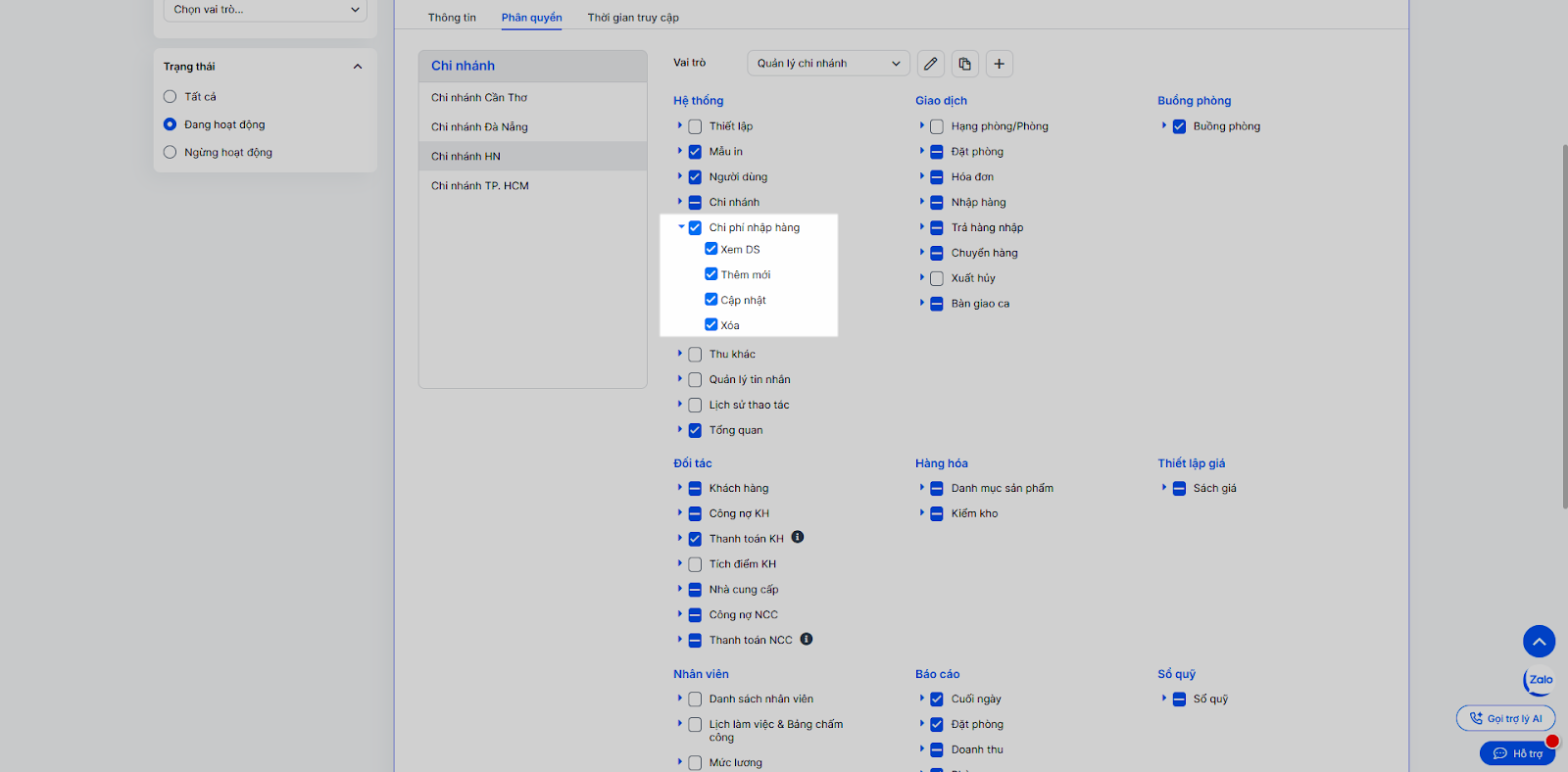 - Phân quyền: Vào phần Thiết lập → Phân quyền truy cập. Bạn có thể phân quyền chi tiết cho tài khoản người dùng (ví dụ: nhân viên mua hàng):