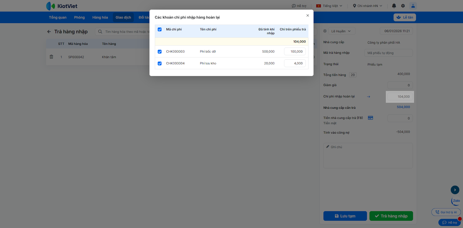 - Nếu loại chi phí có thiết lập Hoàn lại khi trả hàng, hệ thống tự động gợi ý số tiền phí được hoàn lại tương ứng với tỷ lệ số lượng hàng trả (20 bộ).