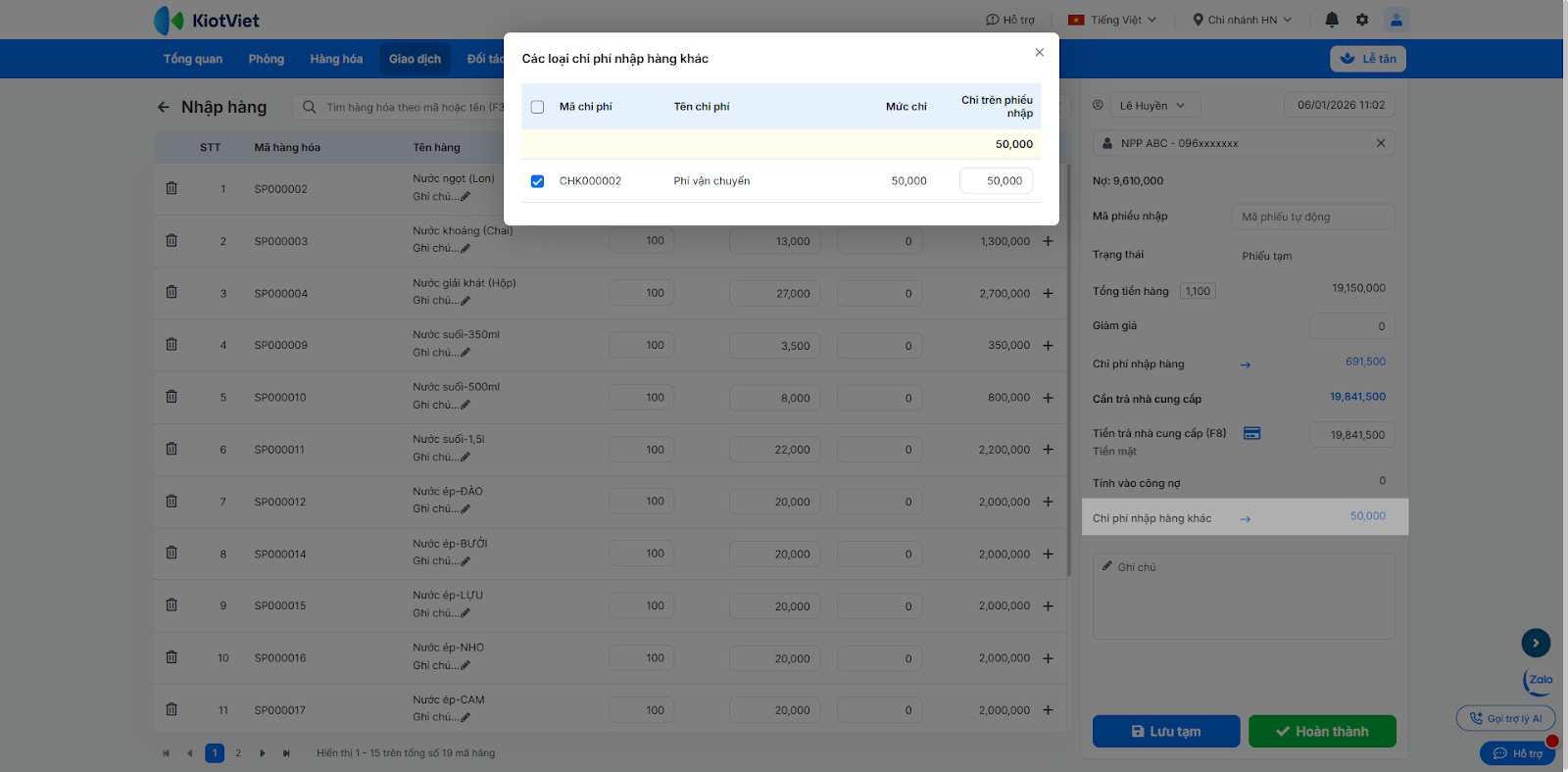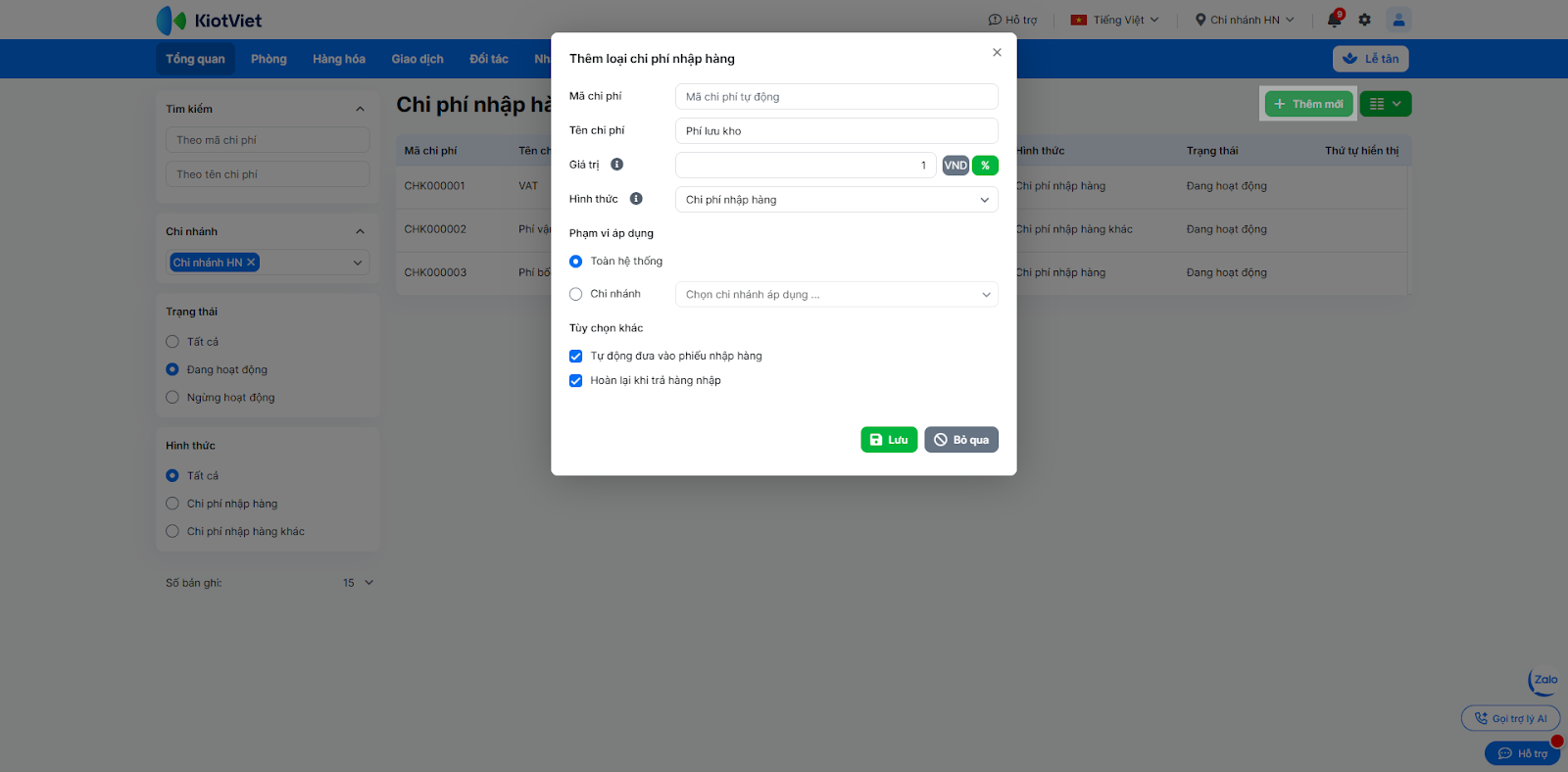 - Tình huống: Bạn cần tạo sẵn danh sách các loại phí thường gặp (như Phí vận chuyển, Phí bốc xếp) để nhân viên kho hoặc lễ tân dễ dàng lựa chọn khi tạo phiếu nhập hàng.