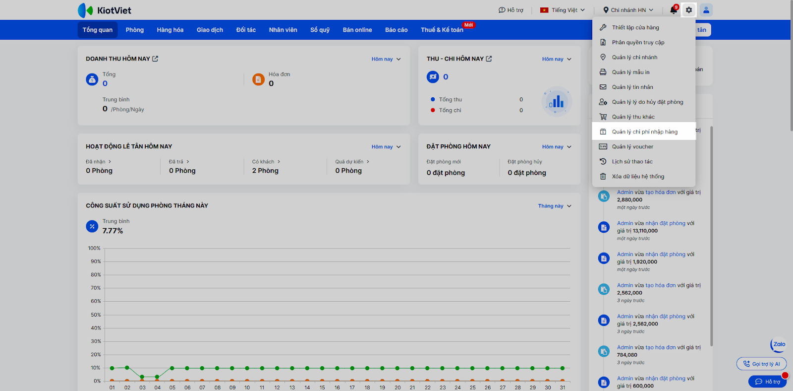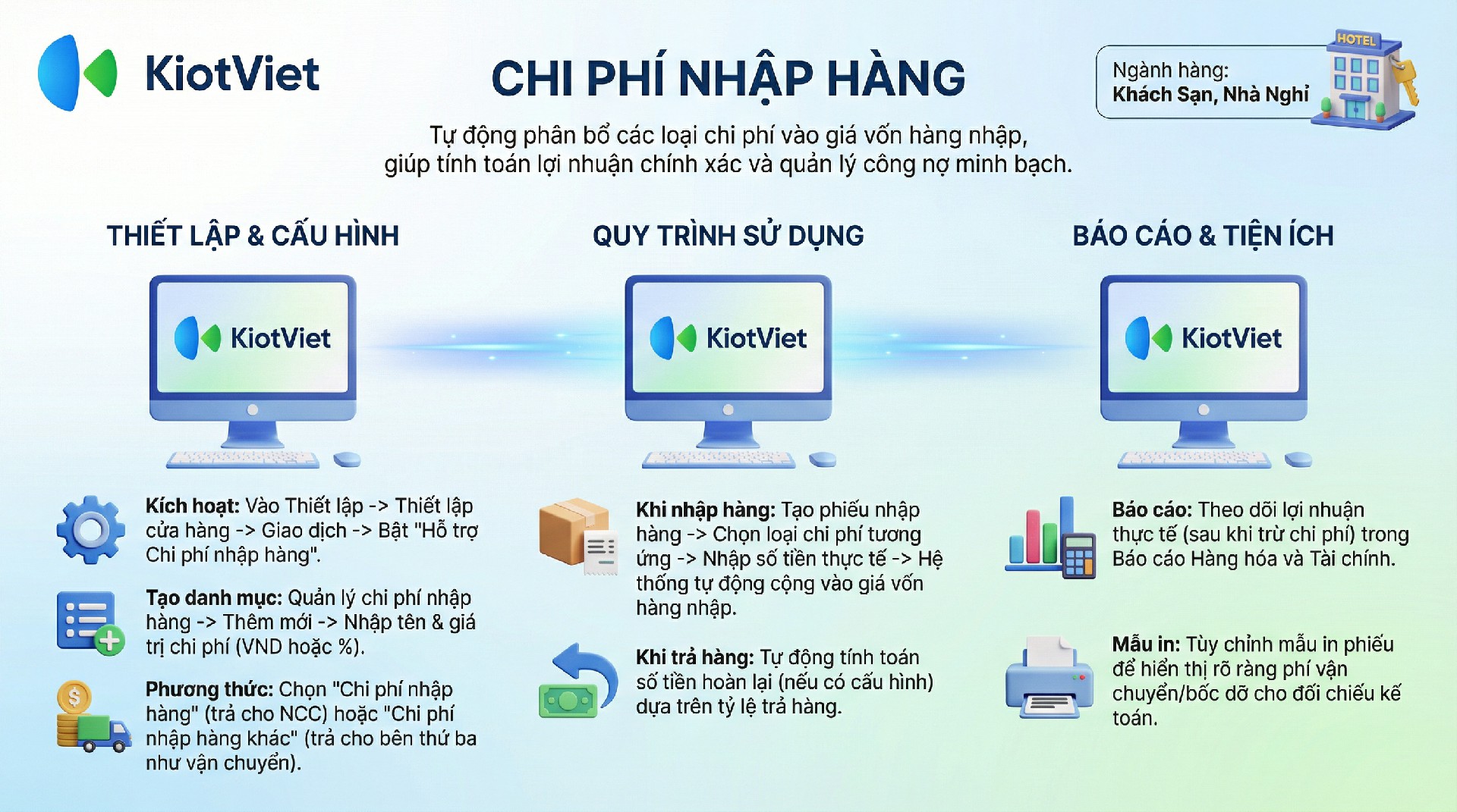 - Báo cáo Tài chính: Hệ thống ghi nhận các khoản “Chi phí nhập hàng khác” vào giá vốn sản phẩm, giúp phản ánh đúng lãi lỗ của khách sạn.