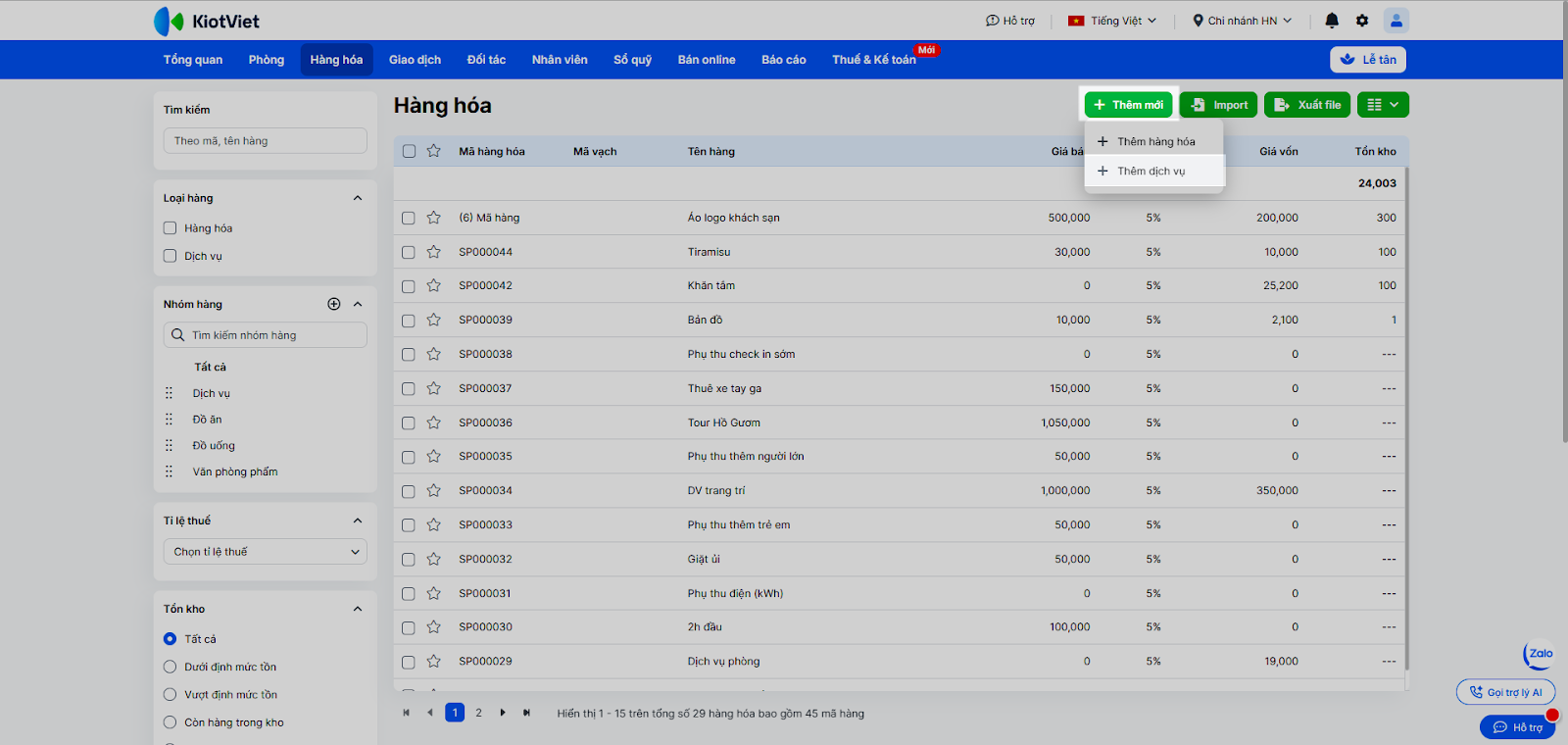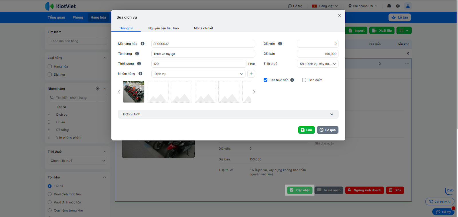 - Vào danh sách hàng hóa, tìm tên dịch vụ.