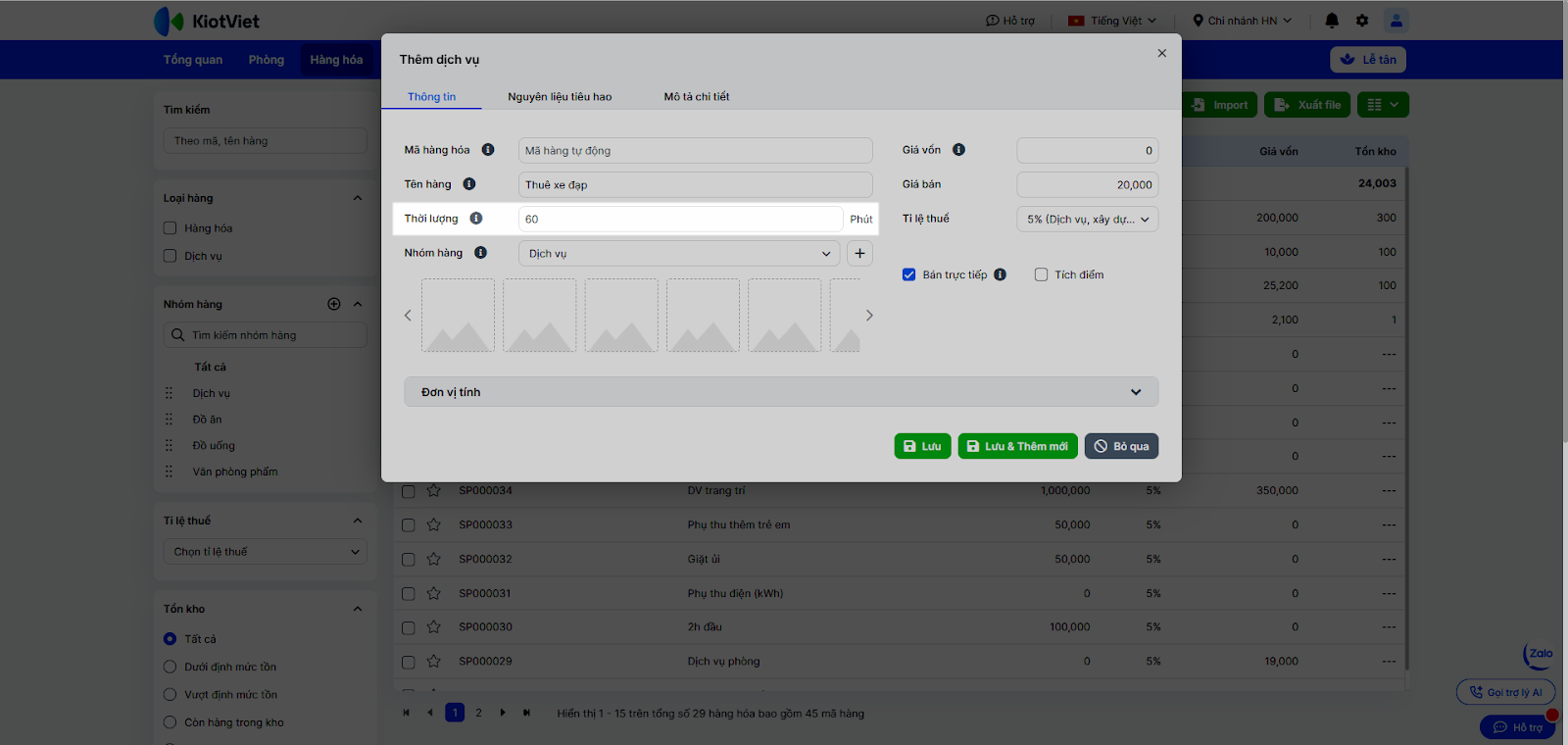 - Tình huống: Khách sạn mở thêm dịch vụ “Giặt khô là hơi” hoặc “Cho thuê xe đạp”. Bạn cần đưa các dịch vụ này vào hệ thống để lễ tân bắt đầu bán.