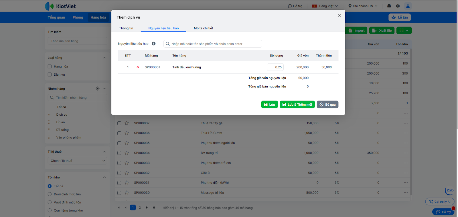 - Tình huống: Khách sạn có dịch vụ Spa/Massage. Mỗi lần làm dịch vụ cho khách sẽ tiêu hao 1 lượng tinh dầu và kem dưỡng nhất định. Bạn muốn hệ thống tự trừ kho các nguyên liệu này.