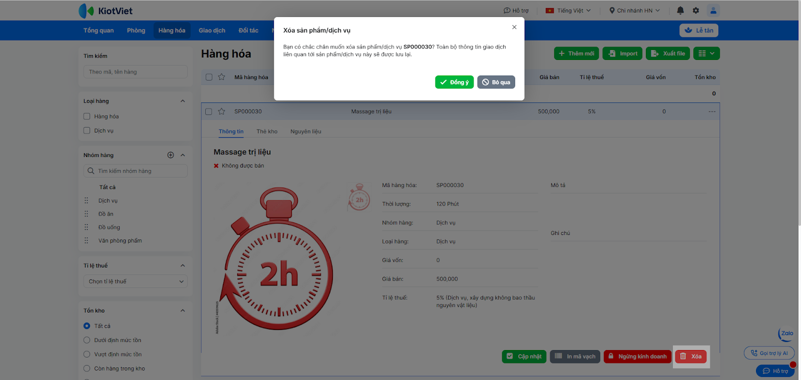 - Xóa: Chỉ nên thực hiện khi tạo nhầm và chưa phát sinh giao dịch nào. Tìm dịch vụ → nhấn X&oa → chọn Đồng ý. Hệ thống sẽ xóa hoàn toàn hàng này nhưng vẫn giữ thông tin trong các giao dịch lịch sử (hóa đơn cũ). Khi xem lại, hàng đã xóa sẽ có thêm hậu tố {DEL}.