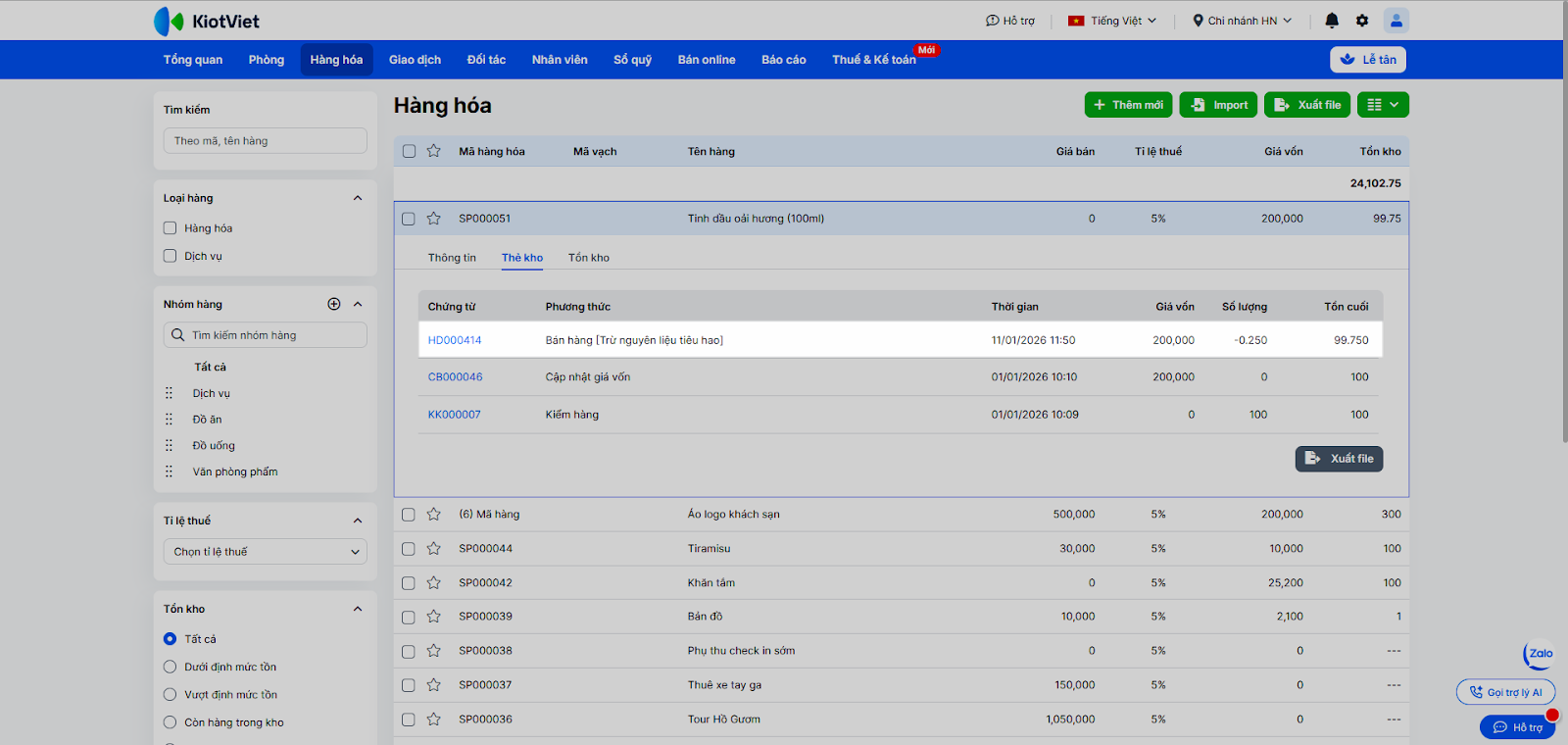 - Kiểm tra: Xem Thẻ kho của mặt hàng Tinh dầu để thấy lịch sử xuất kho tương ứng với mã hóa đơn dịch vụ.