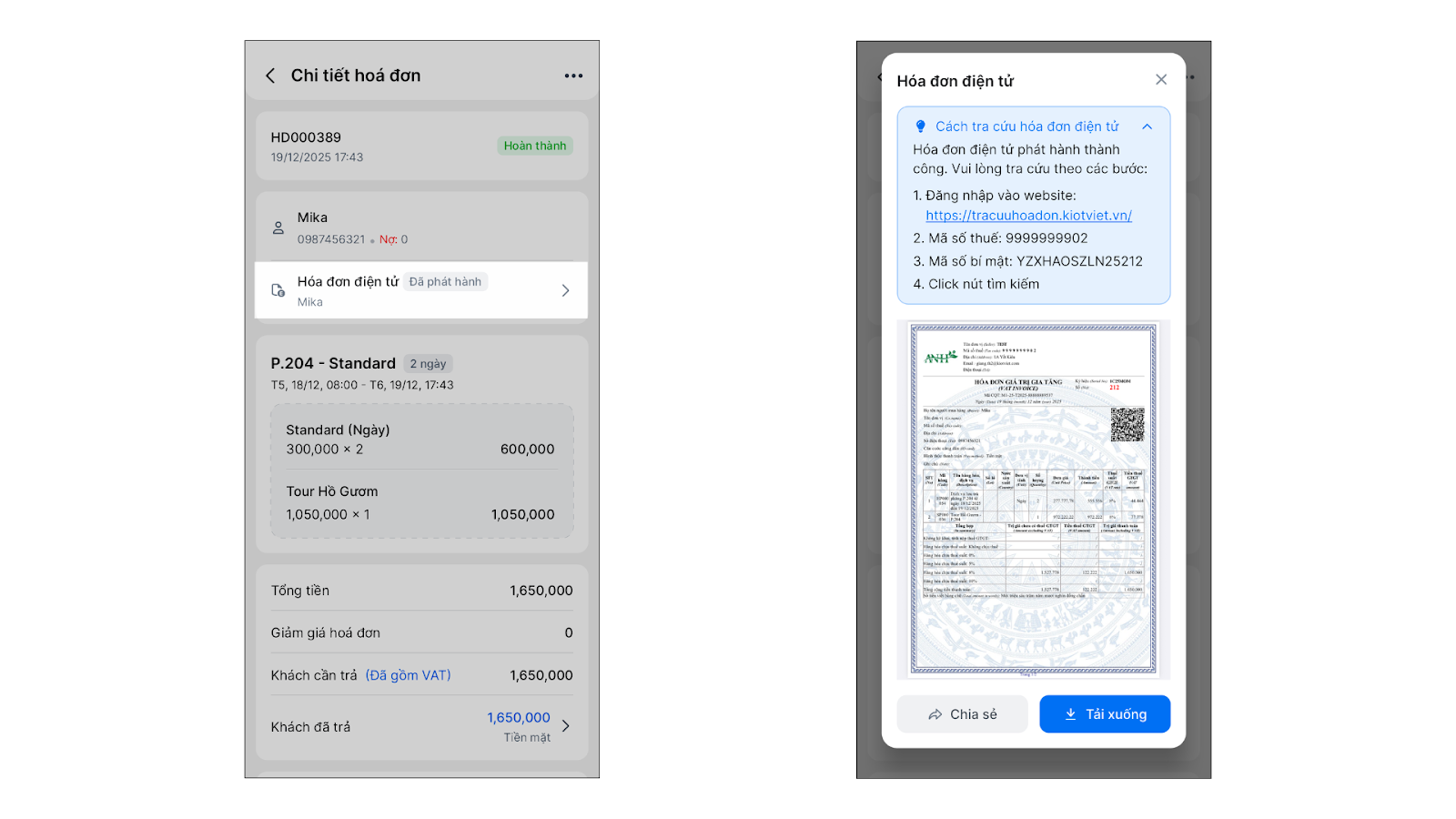 Tính năng Phát hành hóa đơn điện tử trên ứng dụng di động hỗ trợ khách sạn thực hiện các thao tác: phát hành tự động ngay khi hoàn thành hóa đơn và xem hóa đơn điện tử trên trang tra cứu HĐĐT của nhà cung cấp.