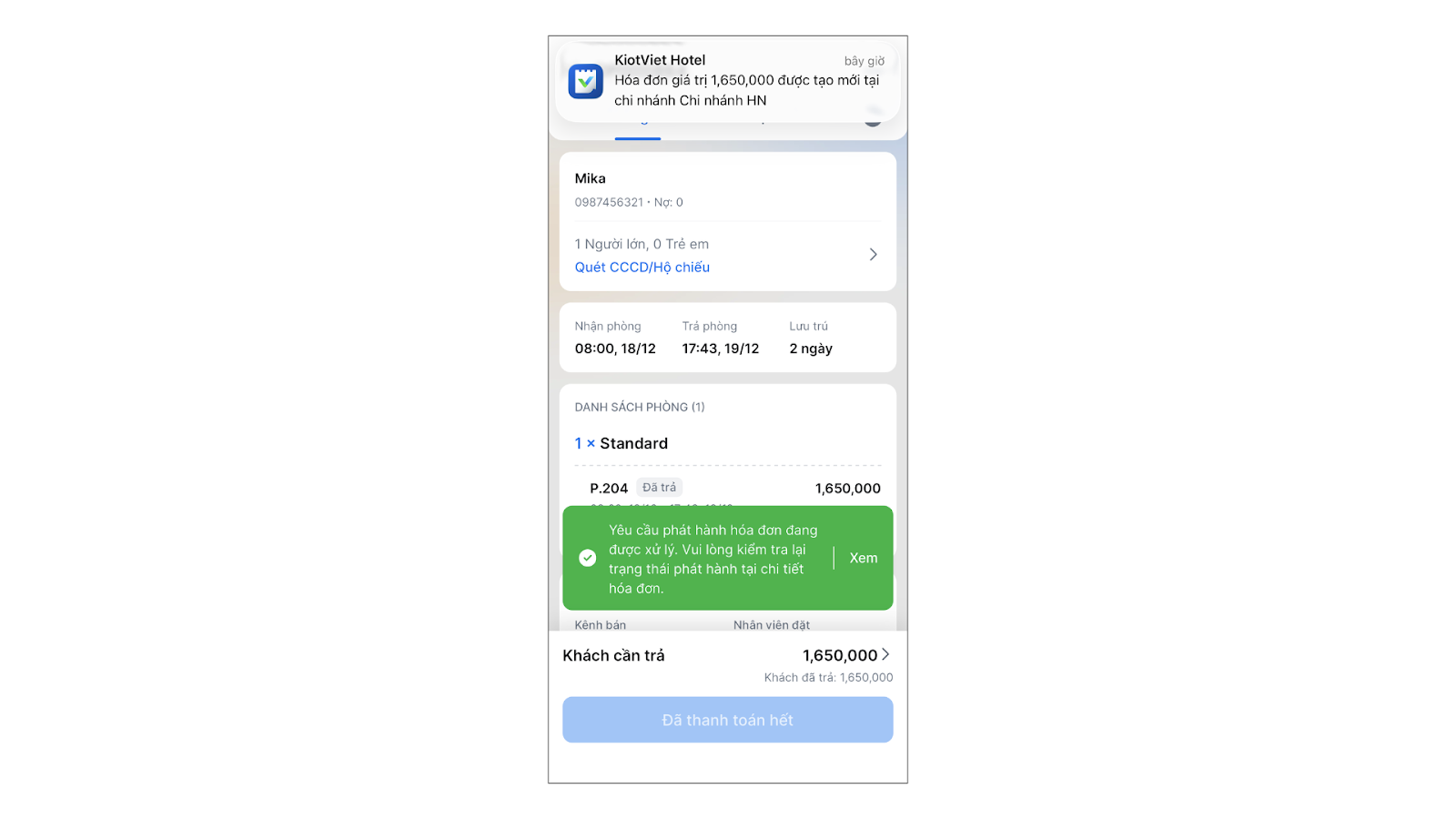 - Xử lý triệt để độ trễ: Hỗ trợ giải quyết vướng mắc về khoảng cách thời gian giữa lúc khách hàng thanh toán tiền phòng và thời điểm lập hóa đơn, đảm bảo tính tức thời.