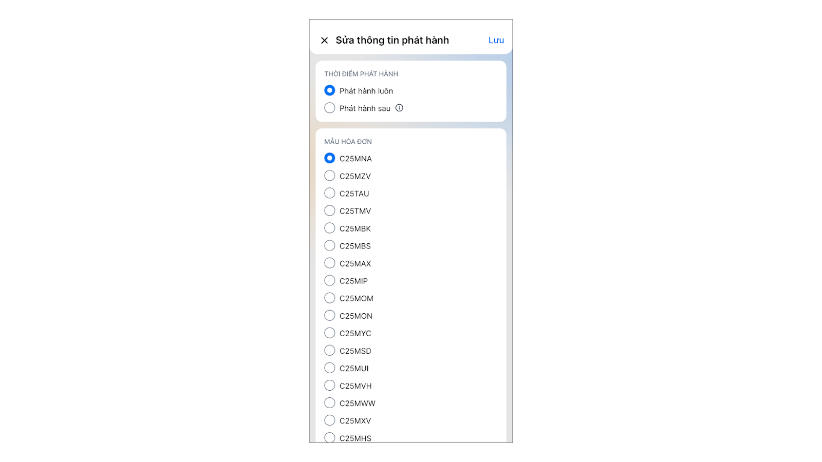 - Chọn Thời điểm phát hành, Mẫu hóa đơn.