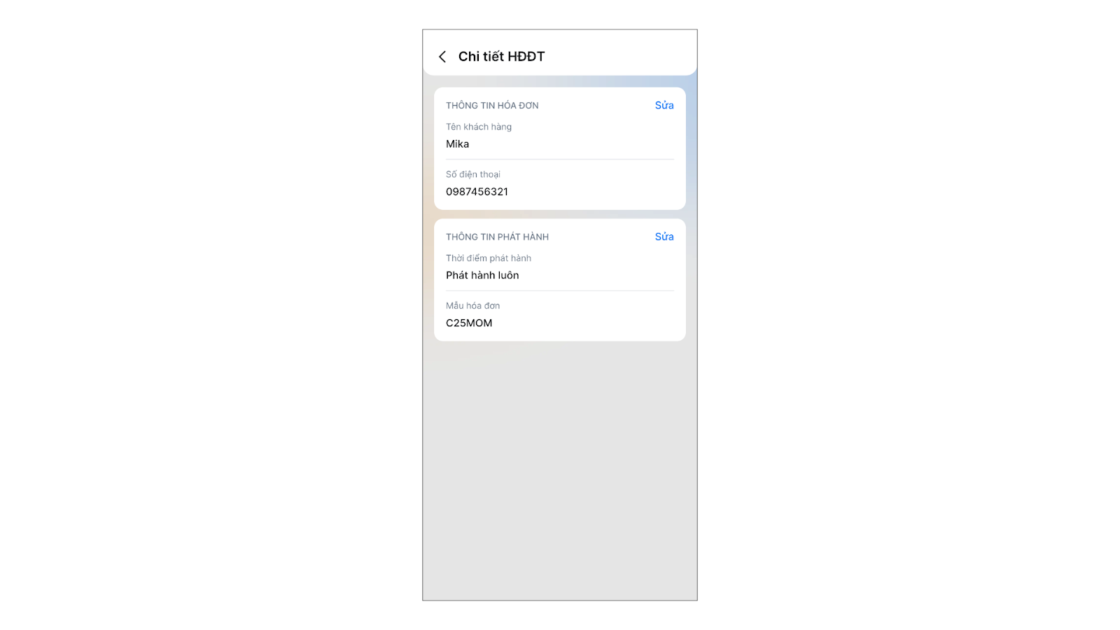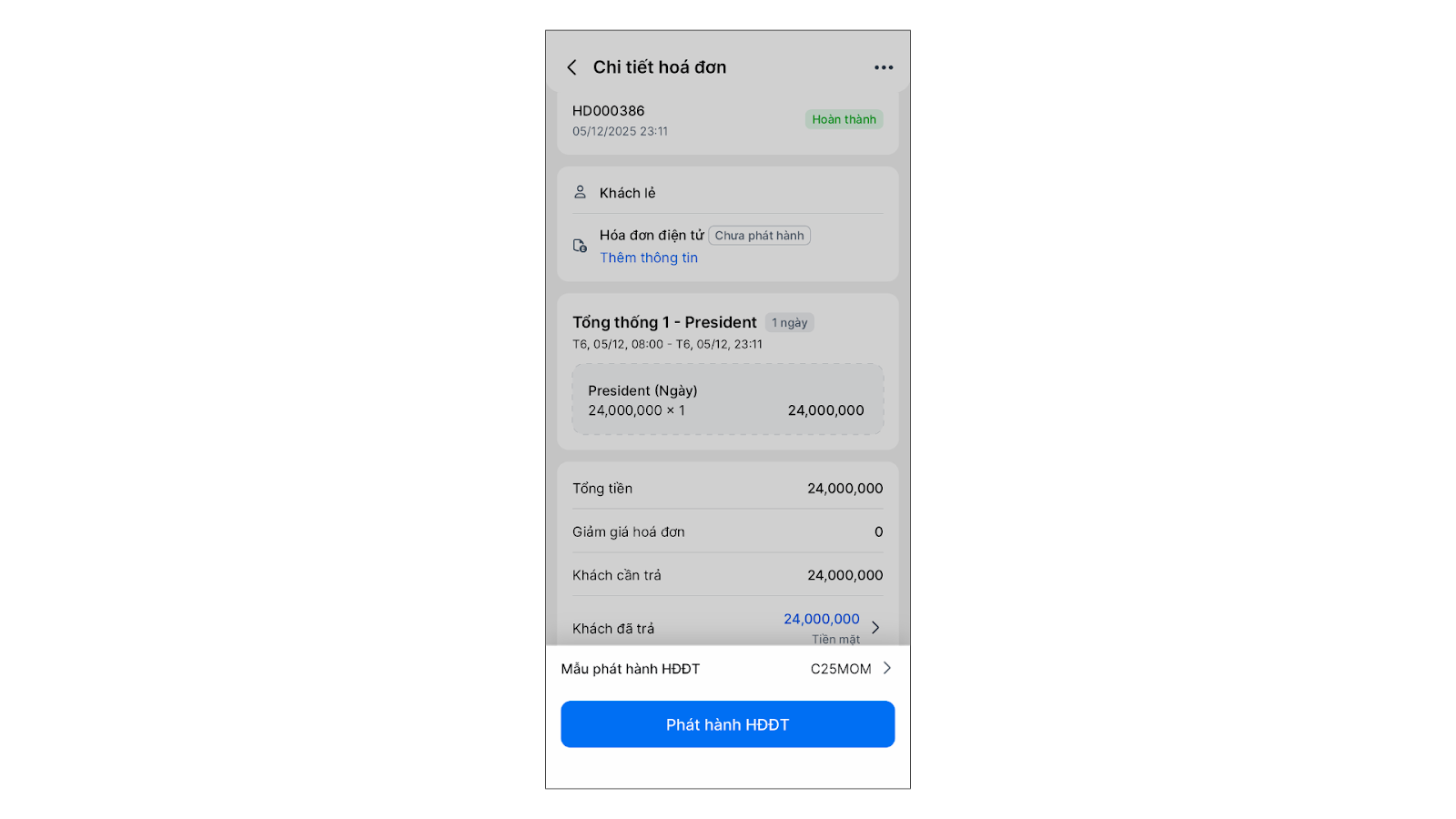 - Ngoài ra, khi xem chi tiết hóa đơn chưa được phát hành hóa đơn điện tử, bạn cũng có thể chọn phát hành hóa đơn điện tử ngay tại màn hình này.