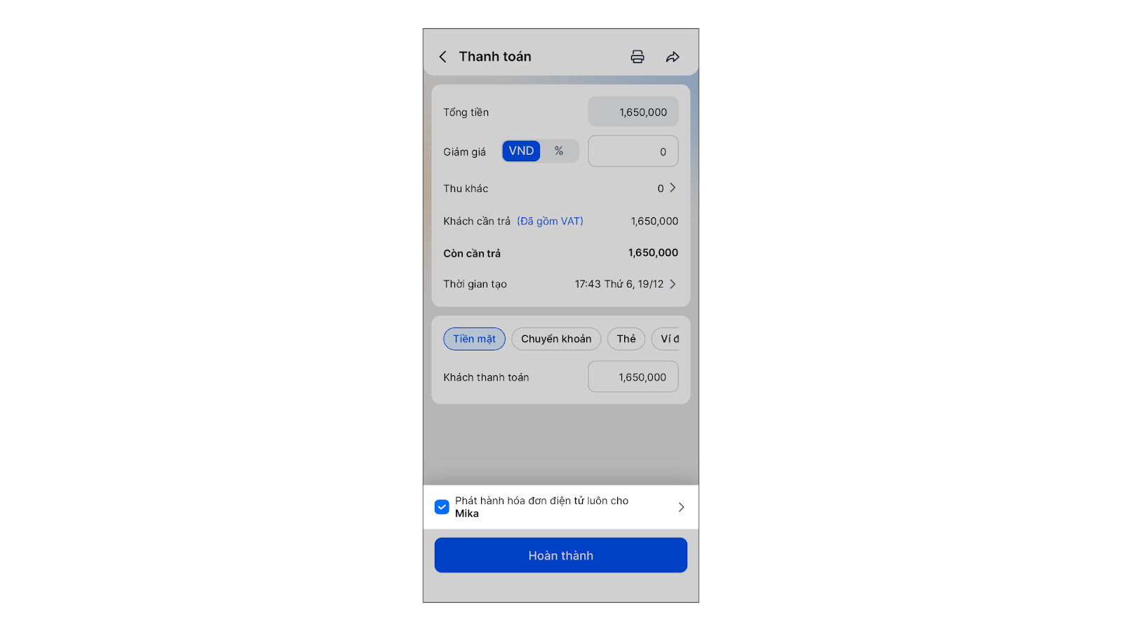- Khi thực hiện thanh toán, bạn tích chọn Phát hành hóa đơn điện tử. Tại đây, bạn có thể nhấn Chi tiết để: