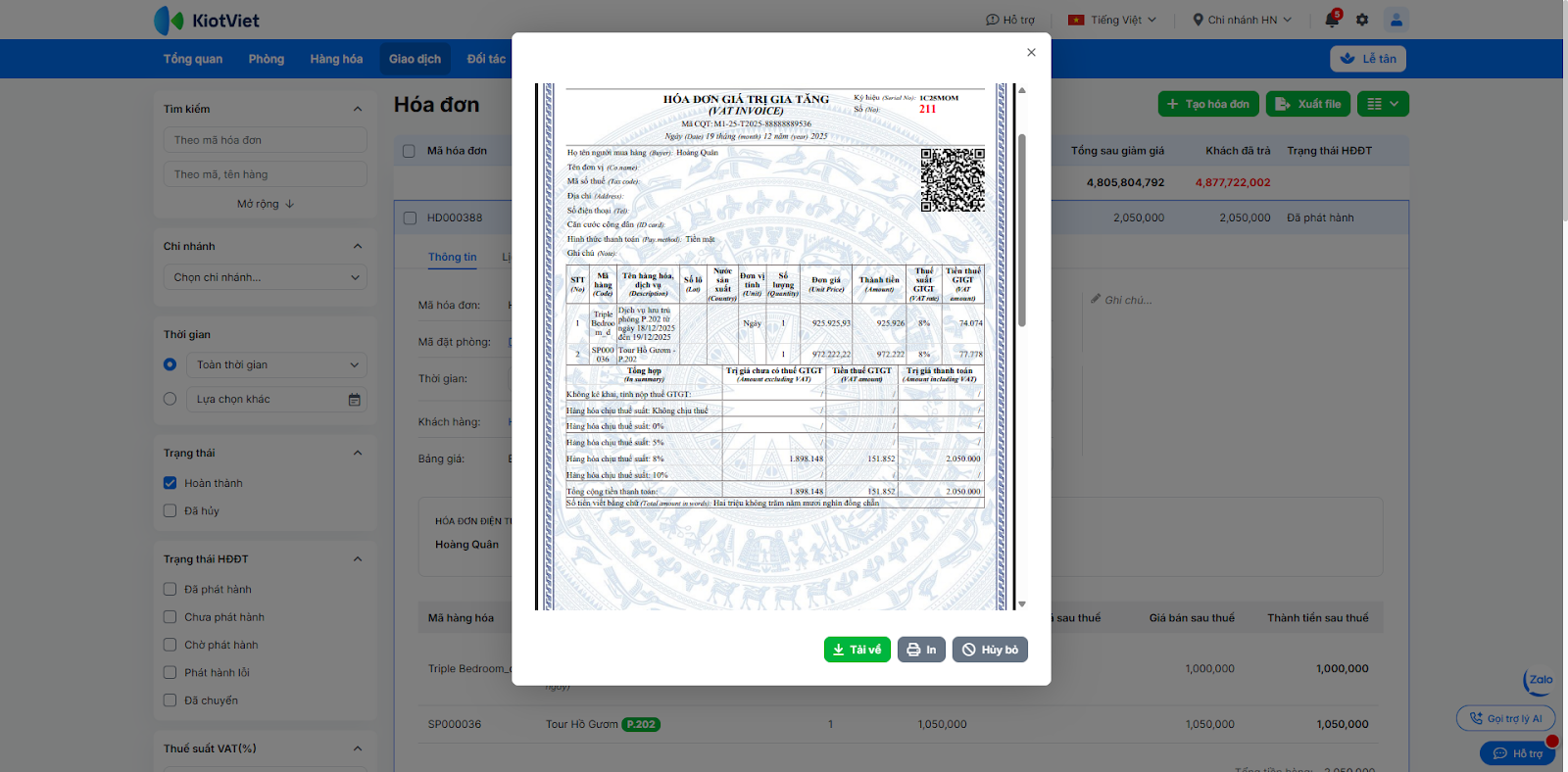 - Tại đây, bạn có thể In hóa đơn (bao gồm mã QR và mã tra cứu).